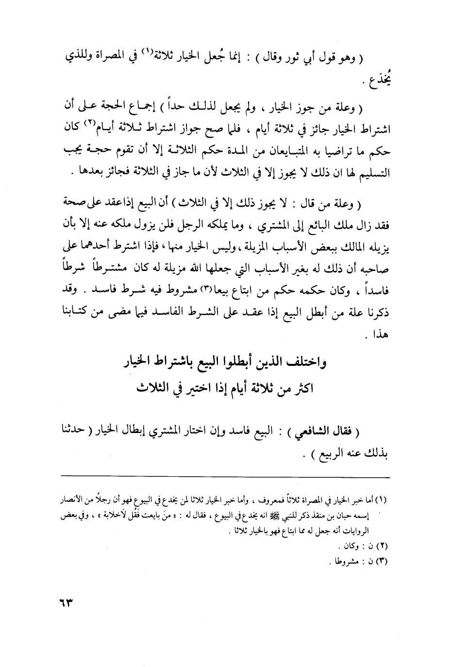 وعلة من جوز الخيار ولم يجعل لذلك حدا إجماع الحجة على أن اشتراط الخيار جائز في ثلاثة أيام2 فلما صح جواز اشتراط ثلاثة أيام كان حكم ما تراضيا به المتبايعان من المدة حكم الثلاثة إلا أن تقوم حجة يجب التسليم لها إن ذلك لا يجوز إلا في الثلاث لأن ما جاز في الثلاثة فجائز بعدها.