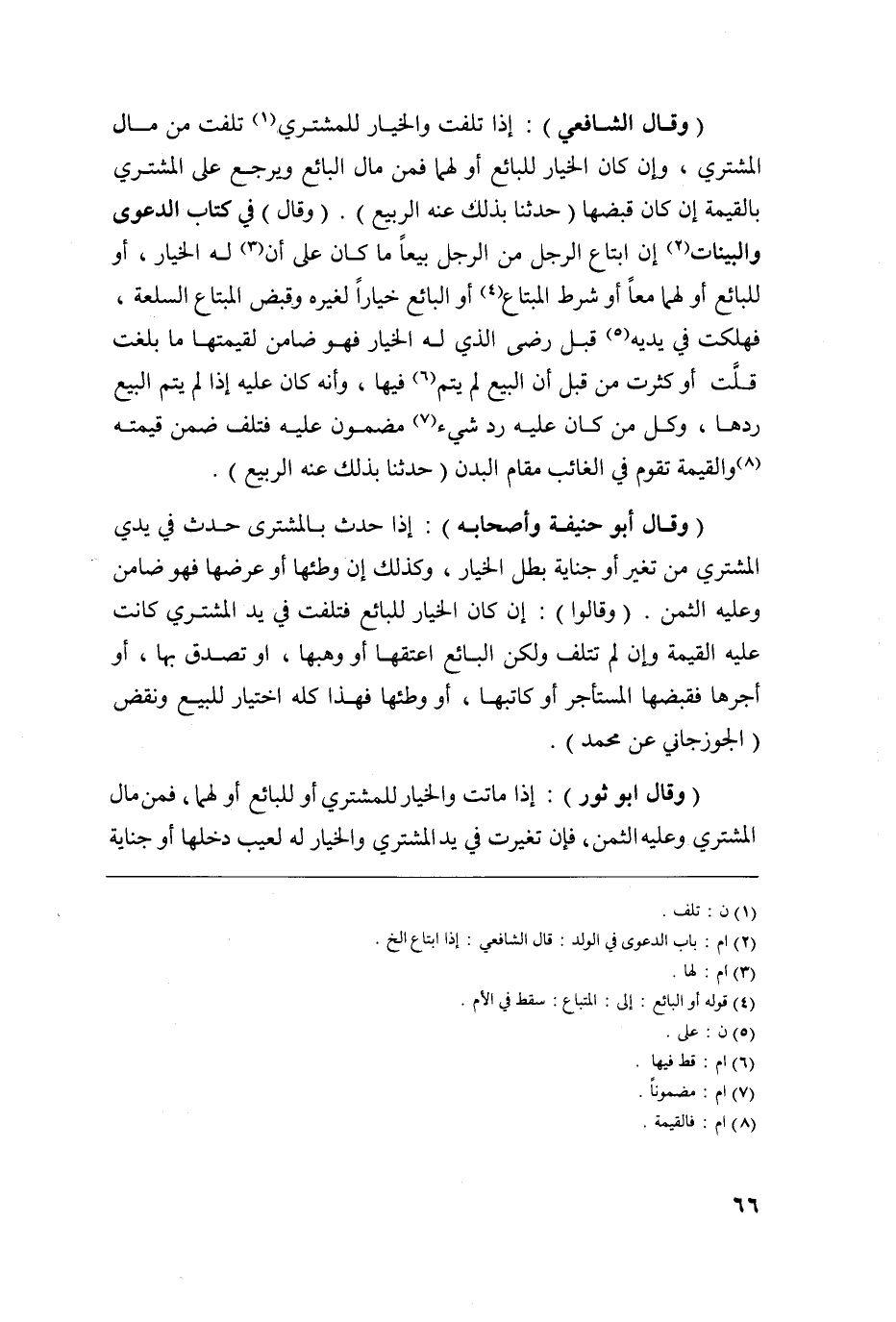 وقال الشافعي إذا تلفت والخيار للمشتري1 تلفت من مال المشتري وإن كان الخيار للبائع أو لهما فمن مال البائع ويرجع على المشتري بالقيمة إن كان قبضها حدثنا بذلك عنه الربيع وقال في كتاب الدعوى والبينات2 إن ابتاع الرجل من الرجل بيعا ما كان على أن3 له الخيار أو للبائع أو لهما معا أو شرط المبتاع4 أو البائع خيارا لغيره وقبض المبتاع السلعة فهلكت في يديه5 قبل رضى الذي له الخيار فهو ضامن لقيمتها ما بلغت قلت أو كثرت من قبل أن البيع لم يتم6 فيها وأنه كان عليه إذا لم يتم البيع ردها وكل من كان عليه رد شيء7 مضمون عليه فتلف ضمن قيمته8 والقيمة تقوم في الغائب مقام البدن حدثنا بذلك عنه الربيع.