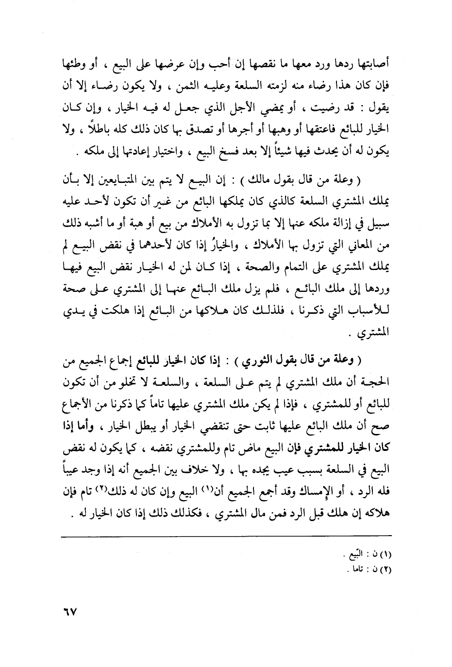 وعلة من قال بقول مالك إن البيع لا يتم بين المتبايعين إلا بأن يملك المشتري السلعة كالذي كان يملكها البائع من غير أن تكون لأحد عليه سبيل في إزالة ملكه عنها إلا بما تزول به الأملاك من بيع أو هبة أو ما أشبه ذلك من المعاني التي تزول بها الأملاك والخيار إذا كان لأحدهما في نقض البيع لم يملك المشتري على التمام والصحة إذا كان لمن له الخيار نقض البيع فيها وردها إلى ملك البائع فلم يزل ملك البائع عنها إلى المشتري على صحة للأسباب التي ذكرنا فلذلك كان هلاكها من البائع إذا هلكت في يدي المشتري.