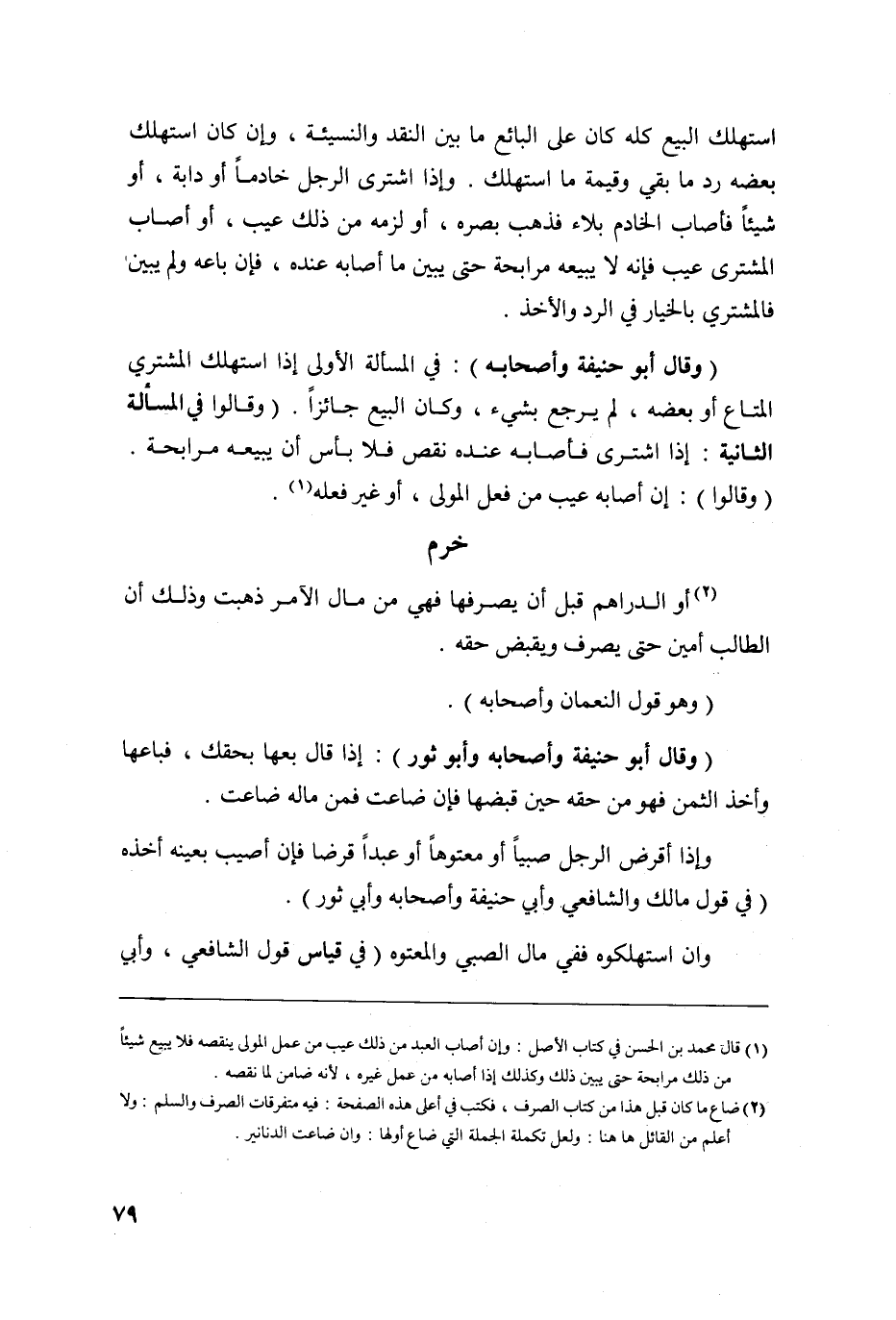وقال أبو حنيفة وأصحابه في المسألة الأولى إذا استهلك المشتري المتاع أو بعضه لم يرجع بشيء وكان البيع جائزا وقالوا في المسألة الثانية إذا اشترى فأصابه عنده نقص فلا بأس أن يبيعه مرابحة وقالوا إن أصابه عيب من فعل المولى أو غير فعله1.