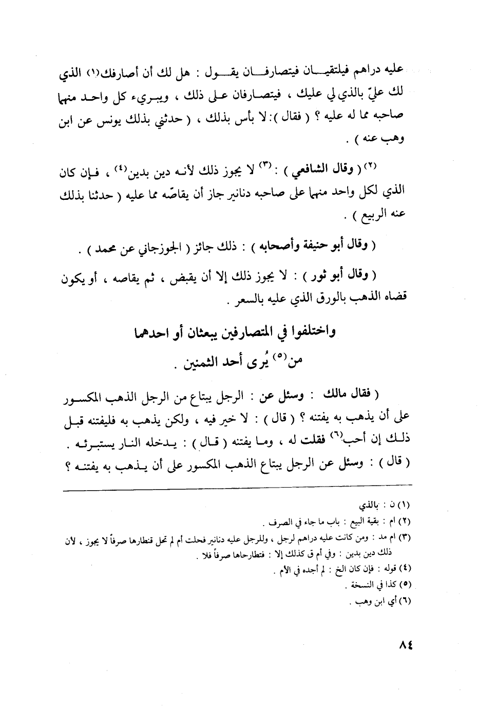 3 أم مد: ومن كانت عليع دراهم لرجل، وللرجل عليه دنانير فحلت أم تحل قنطارها صوفا لا يجوز لأن ذلك دين بدين: وفي أم ق كذلك إلا: قنطارحاها صرفا فلا.