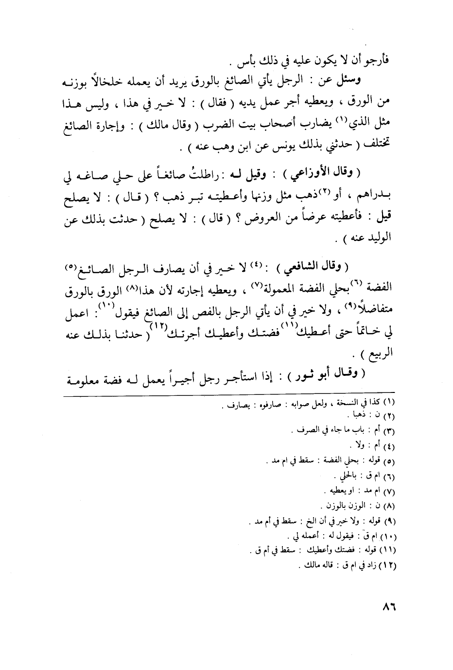 3وقال الشافعي:4 لا خير في أن يصارف الرجل الصائغ5 الفضة6 بحلي الفضة المعمولة7 ويعطيه إجارته لأن هذا8 الورق بالورق متفاضلا9 ولا خير في أن يأتي الرجل بالفص إلى الصائغ فيقول10 اعمل لي خاتما حتى أعطيك11 فضتك وأعطيك أجرتك12 "حدثنا بذلك عنه الربيع".