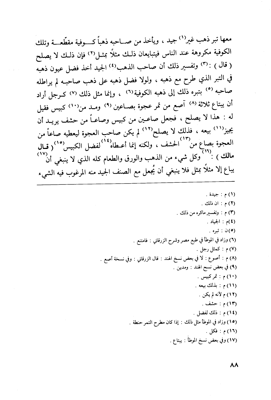 معها تبر ذهب غير1 جيد ويأخذ من صاحبه ذهبا كوفية مقطعة وتلك الكوفية مكروهة عند الناس فيتبايعان ذلك مثلا بمثل2 فإن ذلك لا يصلح قال3 وتفسير ذلك أن صاحب الذهب4 الجيد أخذ فضل عيون ذهبه في التبر الذي طرح مع ذهبه ولولا فضل ذهبه على ذهب صاحبه لم يراطله صاحبه5 بتبره ذلك إلى ذهبه الكوفية6 وإنما مثل ذلك7 كرجل أراد أن يبتاع ثلاثة8 آصع من تمر عجوة بصاعين9 ومد من10 كبيس فقيل له هذا لا يصلح فجعل صاعين من كبيس وصاعا من حشف يريد أن يجيز11 بيعه فذلك لا يصلح12 لم يكن صاحب العجوة ليعطيه صاعا من العجوة بصاع13 من الحشف ولكنه إنما أعطاه14 لفضل الكبيس15 قال مالك:16 وكل شيء من الذهب والورق والطعام كله الذي لا ينبغي أن17 يباع إلا مثلا بمثل فلا ينبغي أن يجعل مع الصنف الجيد منه المرغوب فيه الشيء