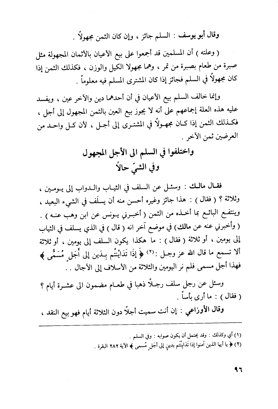 فقال مالك وسئل عن السلف في الثياب والدواب إلى يومين وثلاثة فقال هذا جائز وغيره أحسن منه أن يسلف في الشيء البعيد وينتفع البائع بما أخذه من الثمن أخبرني يونس عن ابن وهب عنه وأخبرني عنه عن مالك في موضع آخر إنه قال في الذي يسلف في الثياب إلى يومين أو ثلاثة فقال ما هكذا يكون السلف إلى يومين أو ثلاثة ألا تسمع ما قال الله عز وجل: 1 {إِذَا تَدَايَنْتُمْ بِدَيْنٍ إِلَى أَجَلٍ مُسَمّىً} فهذا أجل مسمى فلم نر اليومين والثلاثة من الأسلاف إلى الآجال.