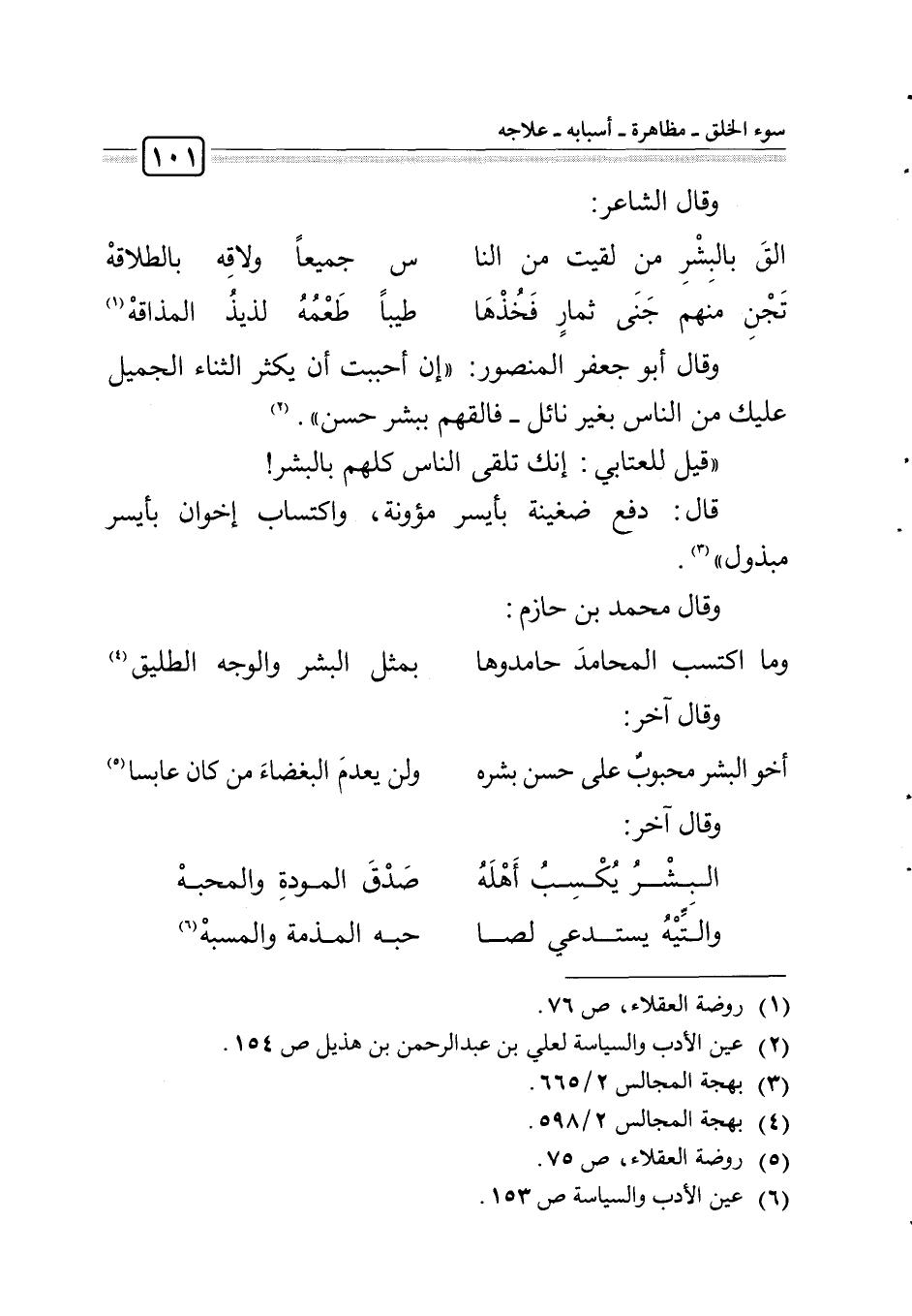 أخو البشر محبوب على حسن بشره ... ولن يعدم البغضاء من كان عابسا5.