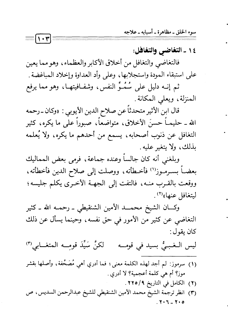 قال ابن الأثير متحدثا عن صلاح الدين الأيوبي: "وكان ـ رحمه الله ـ حليما حسن الأخلاق، ومتواضعا، صبورا على ما يكره، كثير التغافل عن ذنوب أصحابه، يسمع من أحدهم ما يكره، ولا يعلمه بذلك، ولا يتغير عليه.