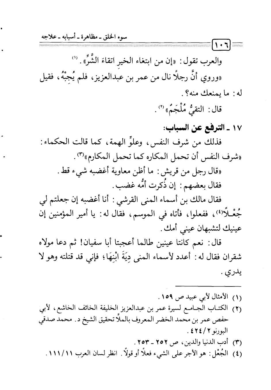 "وروي أن رجلا نال من عمر بن عبد العزيز، فلم يجبه، فقيل له: ما يمنعك منه؟