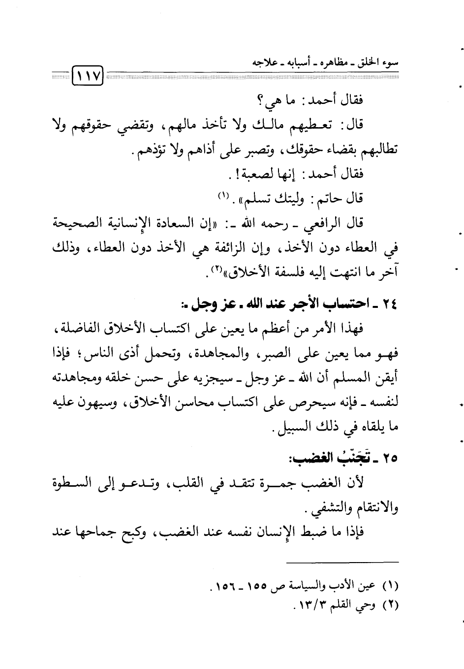 قال الرافعي ـ رحمه الله ـ "إن السعادة الإنسانية الصحيحة في العطاء دون الأخذ، وإن الزائفة هي الأخذ دون العطاء، وذلك آخر ما انتهت إليه فلسفة الأخلاق"2.