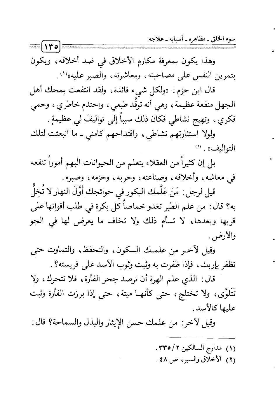 وهذا يكون بمعرفة مكارم الأخلاق في ضد أخلاقه، ويكون بتمرين النفس على مصاحبته، ومعاشرته، والصبر عليه"1.