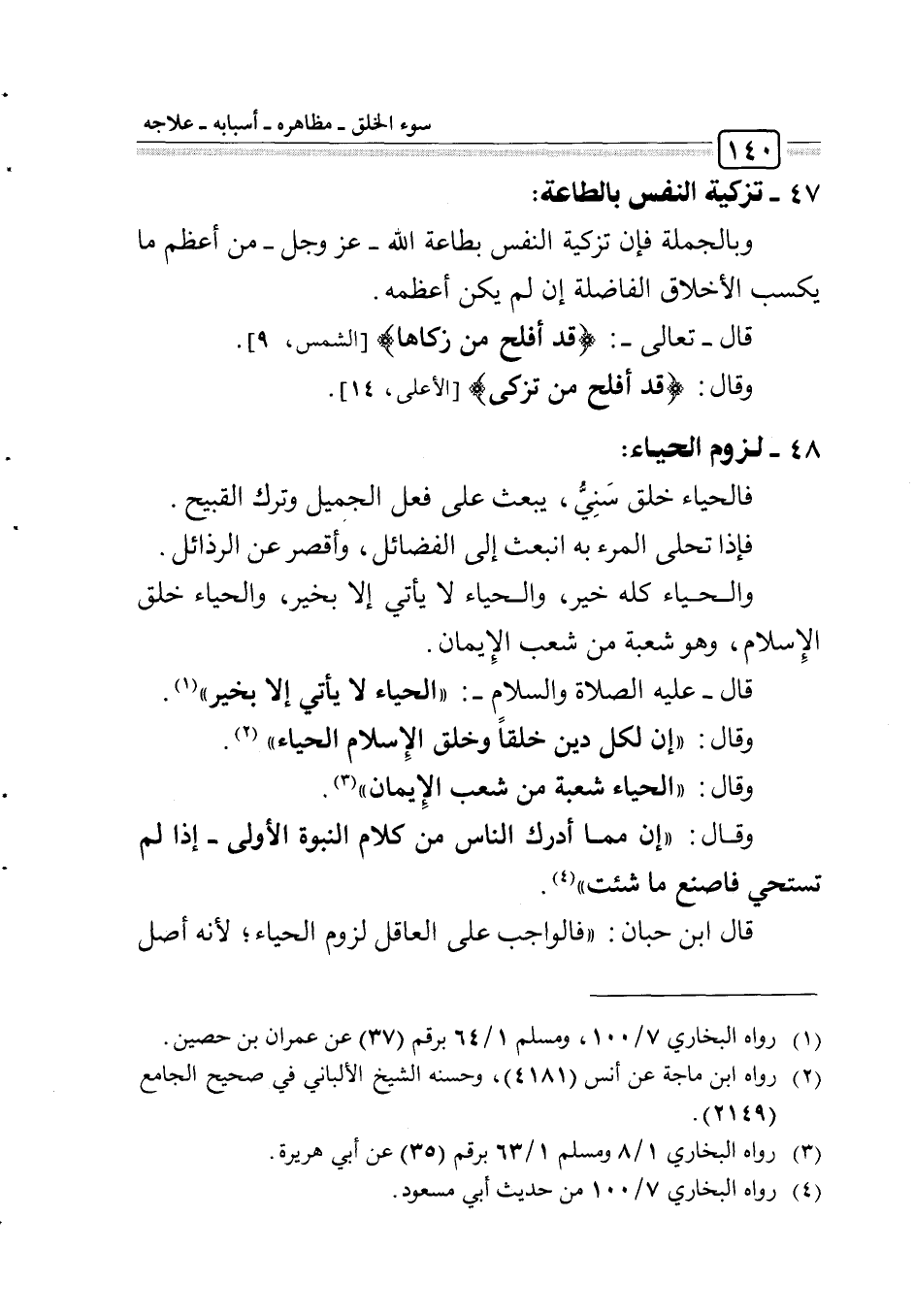 وبالجملة فإن تزكية النفس بطاعة الله ـ عز وجل ـ من أعظم ما يكسب الأخلاق الفاضلة إن لم يكن أعظمه.