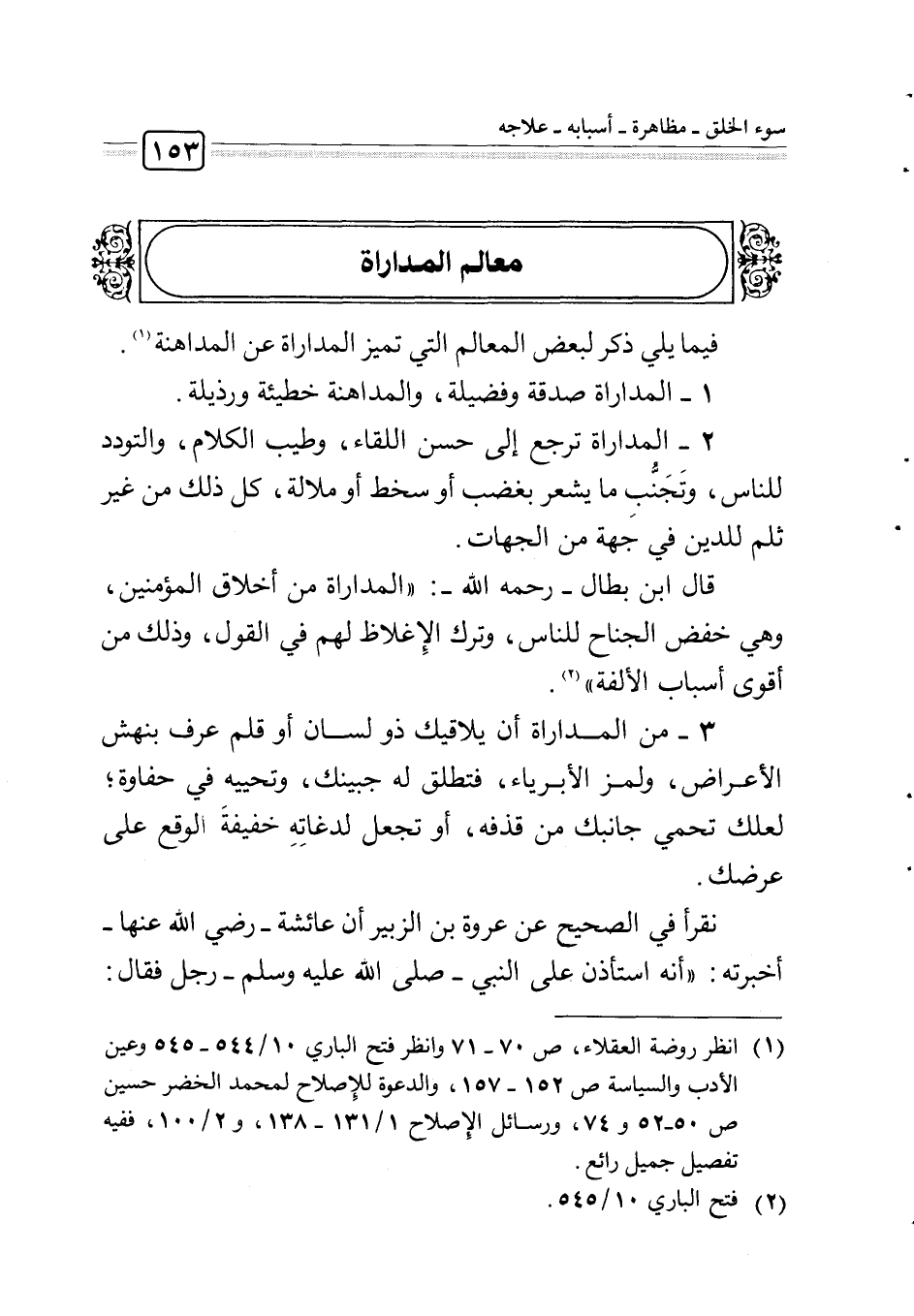 2ـ المداراة ترجع إلى حسن اللقاء، وطيب الكلام، والتودد للناس، وتجنب ما يشعر بغضب أو سخط أو ملالة، كل ذلك من غير ثلم للدين في جهة من الجهات.