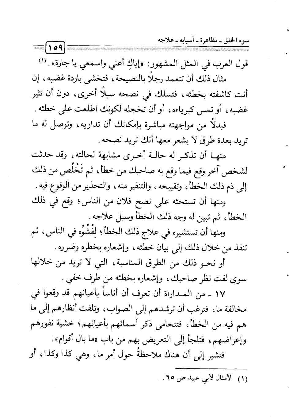 17ـ من المداراة أن تعرف أن أناسا بأعيانهم قد وقعوا في مخالفة ما، فترغب أن ترشدهم إلى الصواب، وتلفت أنظارهم إلى ما هم فيه من الخطأ، فتتحامى ذكر أسمائهم بأعيانهم؛ خشية نفورهم وإعراضهم، فتلجأ إلى التعريض بهم من باب "ما بال أقوام".
