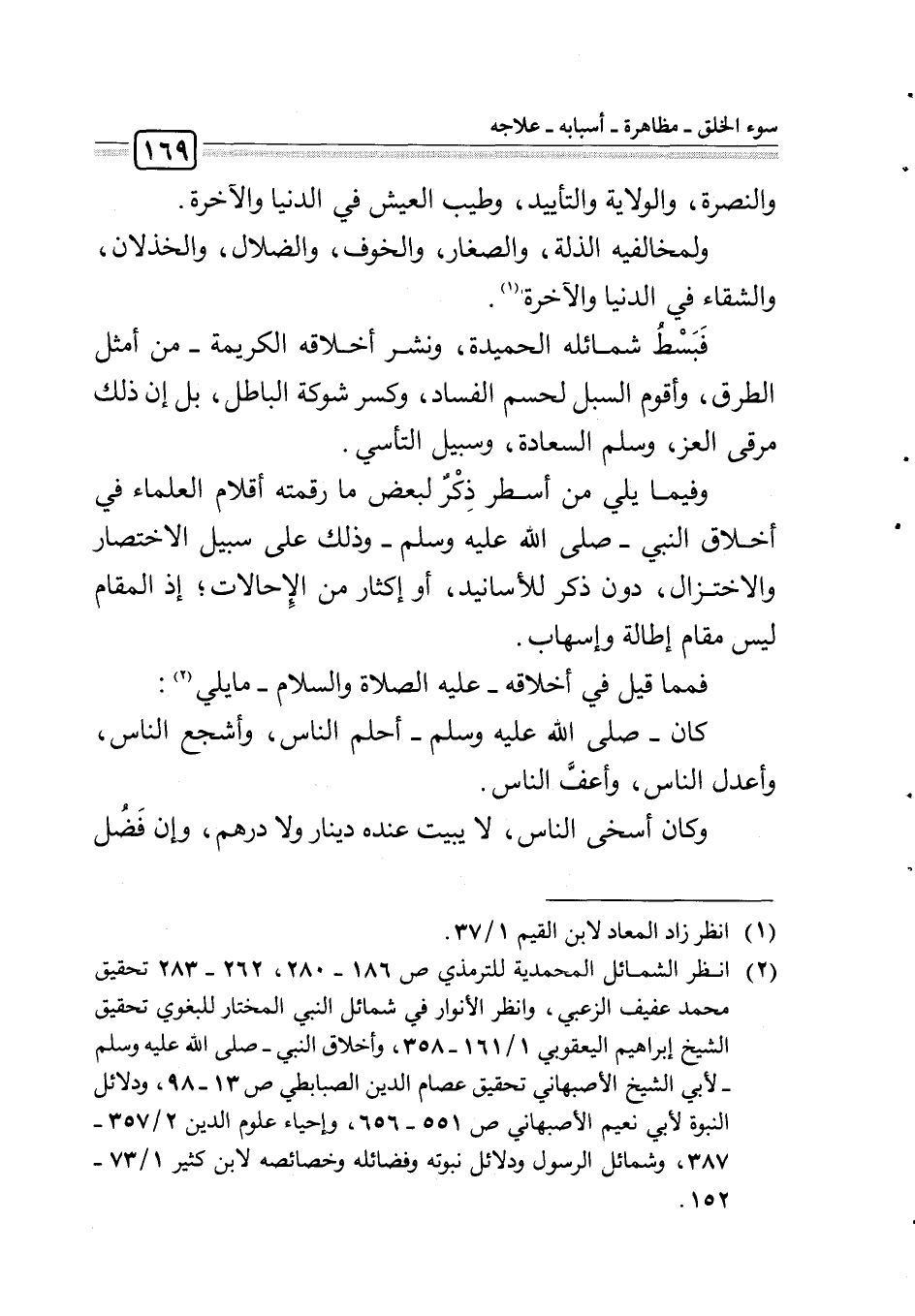 2 انظر: الشمائل المحمدية للترمذي، ص 186ـ280، 262ـ 283 تحقيق محمد عفيف الزعبي، وانظر الأنوار في شمائل النبي المختار للبغوي، تحقيق الشيخ إبراهيم اليعقوبي1/161ـ358، وأخلاق النبي ـ صلى الله عليه وسلم ـ لأبي الشيخ الأصبهاني تحقيق عصام الدين الصبابطي، ص 13ـ98، ودلائل النبوة لأبي نعيم الأصبهاني، ص 551ـ656، وإحياء علوم الدين2/357ـ387، وشمائل الرسول ودلائل نبوته وفضائله وخصائصه لابن كثير1/73ـ152.