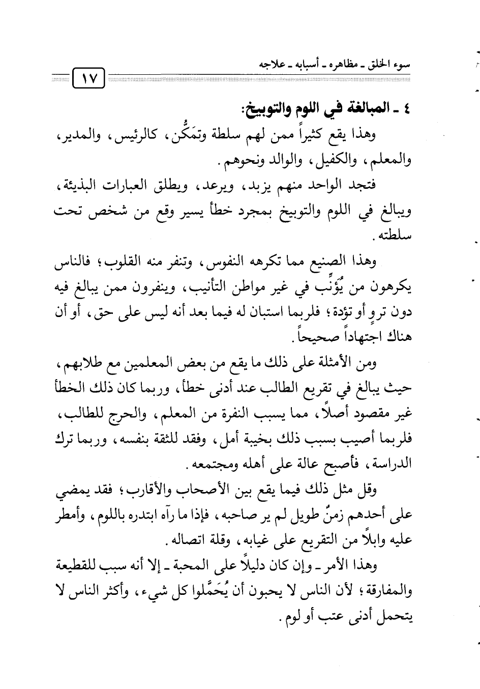 وهذا الصنيع مما تكرهه النفوس، وتنفر منه القلوب؛ فالناس يكرهون من يؤنب في غير مواطن التأنيب، وينفرون ممن يبالغ فيه دون ترو أو تؤدة؛ فلربما استبان له فيما بعد أن ليس على حق، أو أن هناك اجتهادا صحيحا.