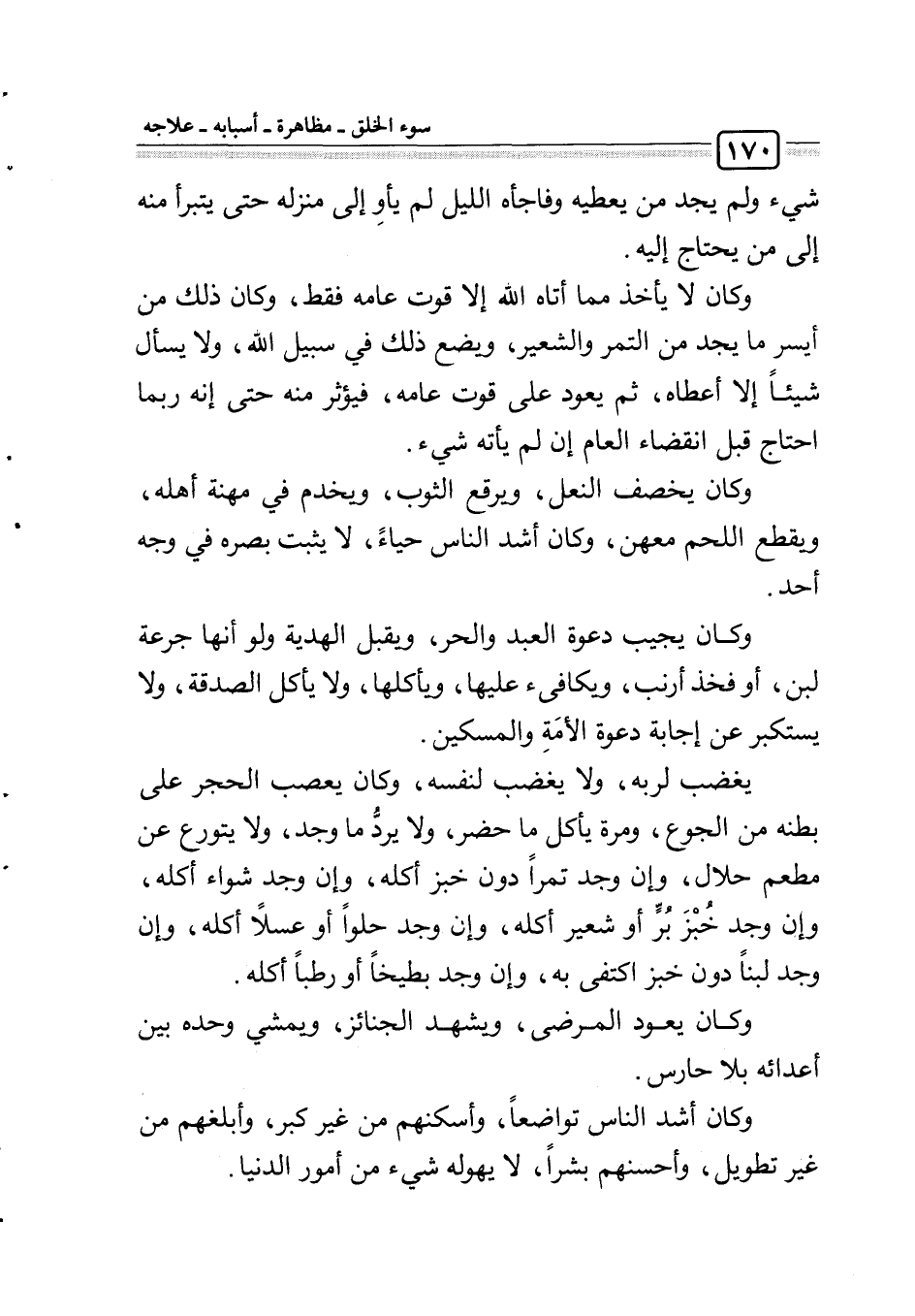 يغضب لربه، ولا يغضب لنفسه، وكان يعصب الحجر على بطنه من الجوع، ومرة يأكل ما حضر، ولا يرد ما وجد، ولا يتورع عن مطعم حلال، وإن وجد تمرا دون خبز أكله، وإن وجد شواء أكله، وإن وجد خبز بر أو شعير أكله، وإن وجد حلوا أو عسلا أكله، وإن وجد لبنا دون خبز اكتفى به، ويشهد الجنائز، ويمشي وحده بين أعدائه بلا حارس.