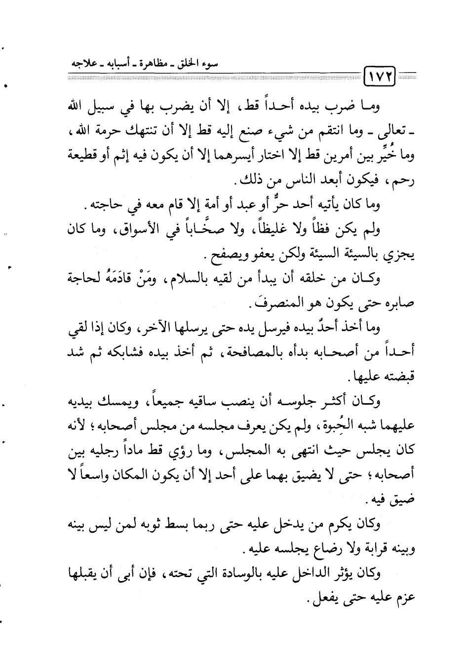وما ضرب بيده أحدا قط، إلا أن يضرب بها في سبيل الله ـ تعالى ـ وما انتقم من شيء صنع إليه قط إلا أن تنتهك حرمة الله، وما خير بين أمرين قط إلا اختار أيسرهما إلا أن يكون فيه إثم أو قطيعة رحم، فيكون أبعد الناس من ذلك.