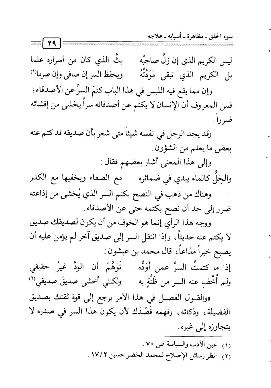 "والقول الفصل في هذا الأمر يرجع إلى قوة ثقتك بصديق الفضيلة، وذكائه، وفهمه قصدك لأن يكون هذا السر في صدره لا يتجاوزه إلى غيره.