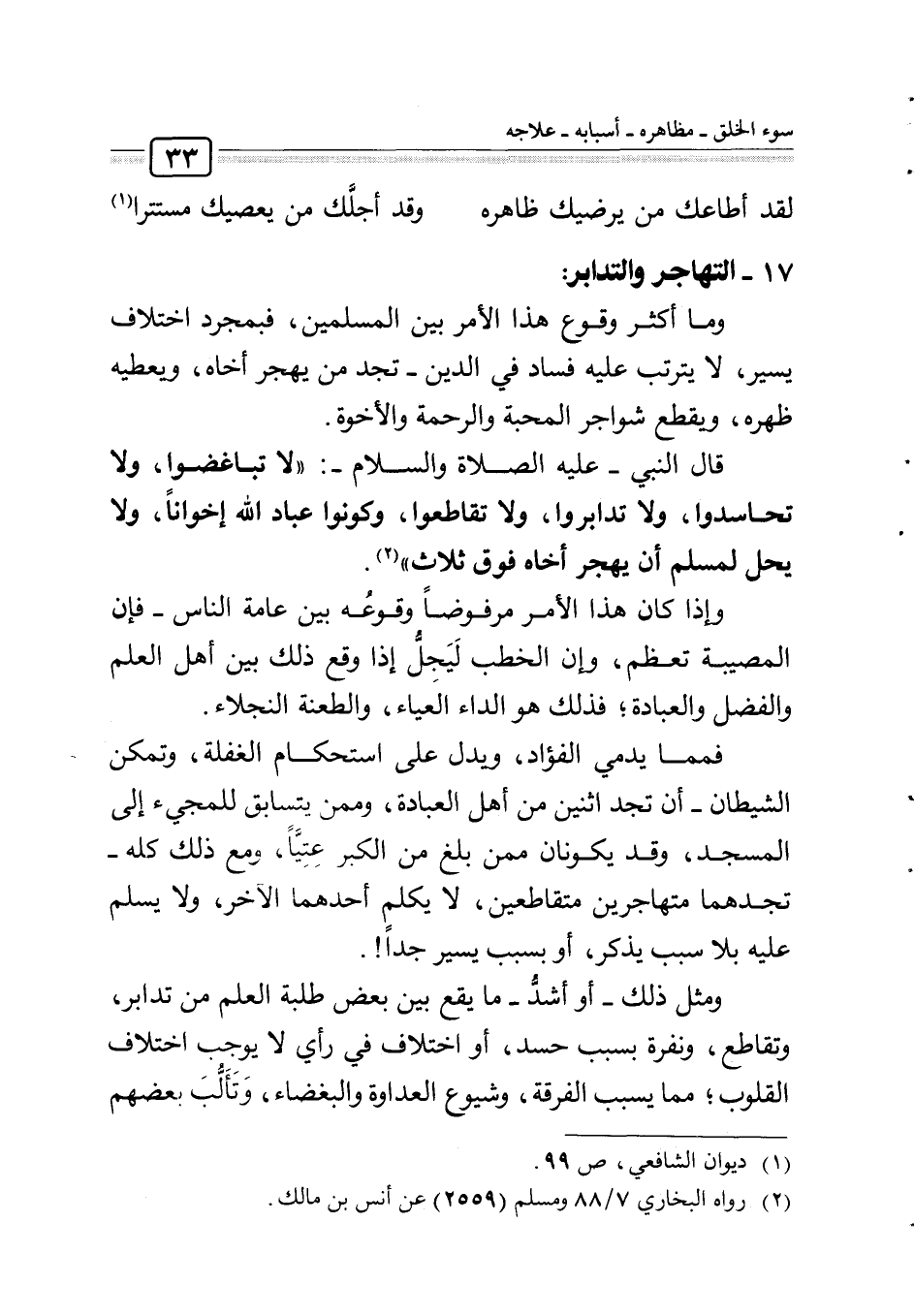 فمما يدمي الفؤاد، ويدل على استحكام الغفلة، وتمكن الشيطان أن تجد اثنين من أهل العبادة، وممن يتسابق للمجيء إلى المسجد، وقد يكونان ممن بلغ من الكبر عتيا، ومع ذلك كله تجدهما متهاجرين متقاطعين، لا يكلم أحدهما الآخر، ولا يسلم عليه بلا سبب يذكر، أو بسبب يسير جدا!.
