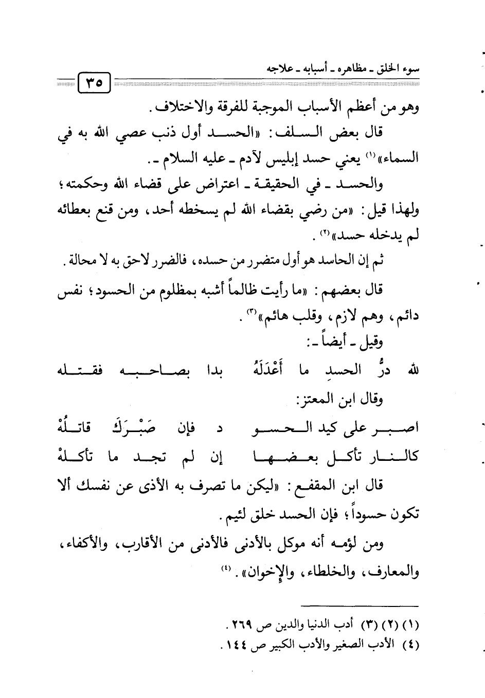 قال ابن المقفع: "ليكن ما تصرف به الأذى عن نفسك ألا تكون حسودا؛ فإن الحسد خلق لئيم.