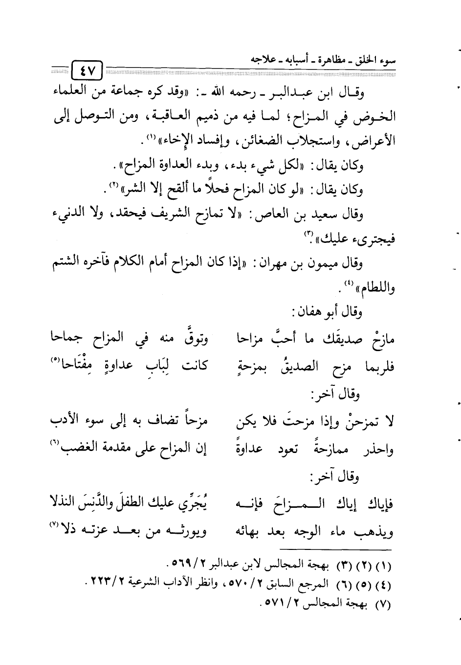 وقال ابن عبد البر ـ رحمه الله ـ "وقد كره جماعة من العلماء الخوض في المزاح؛ لما فيه من ذميم العاقبة، ومن التوصل إلى الأعراض، واستجلاب الضغائن، وإفساد الإخاء"1.