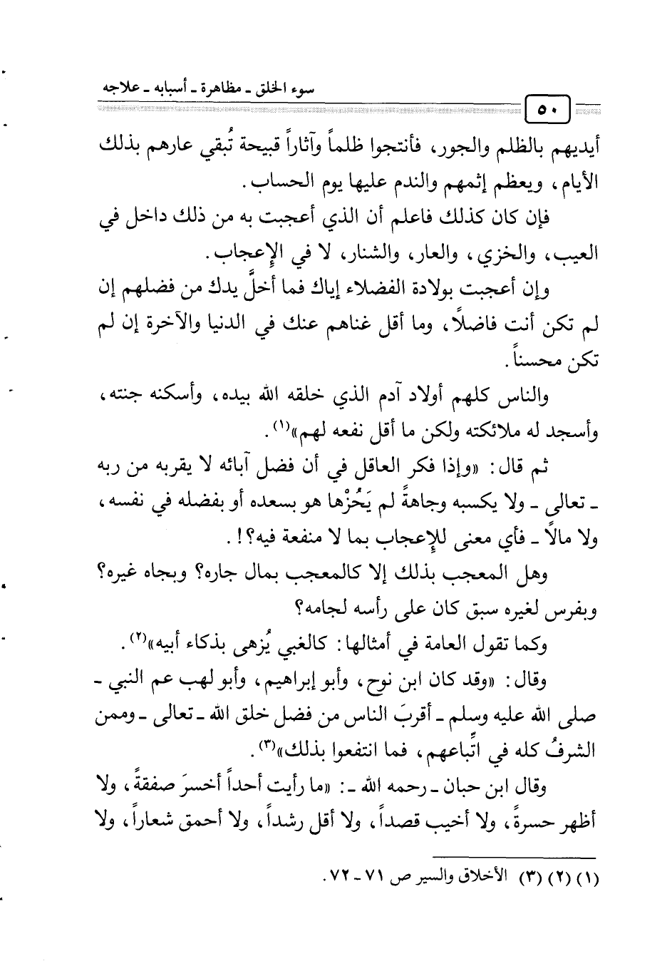 ثم قال: "وإذا فكر العاقل في أن فضل آبائه لا يقربه من ربه ـ تعالى ـ ولا يكسبه وجاهة لم يحزها هو بسعده أو بفضله في نفسه، ولا مالا ـ فأي معنى للإعجاب بما لا منفعة فيه؟ !