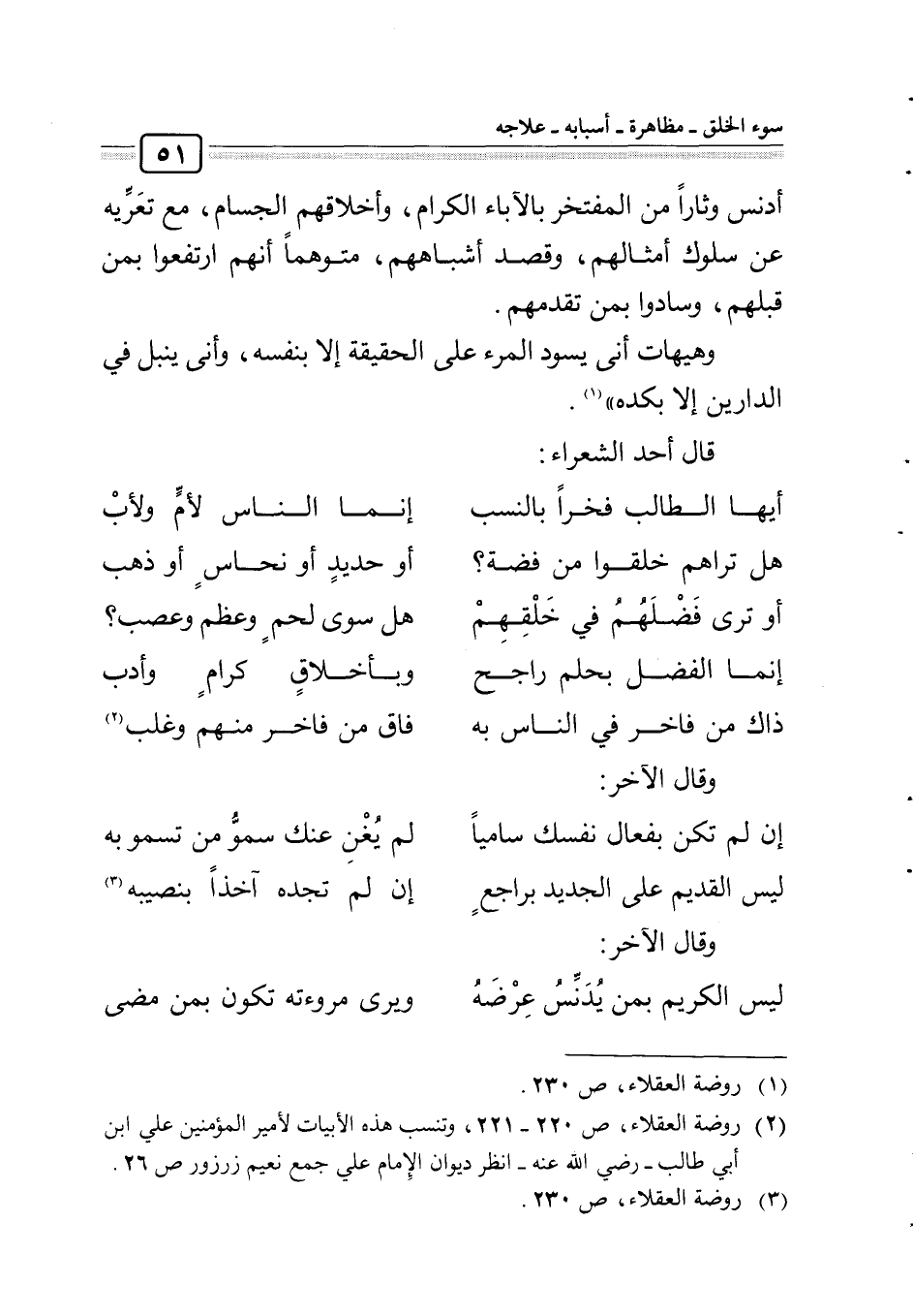 2 روضة العقلاء، ص 220ـ221، وتنسب هذه الأبيات لأمير المؤمنين علي بن أبي طالب ـ رضي الله عنه ـ انظر: ديوان علي جمع نعيم زرزور ص 26.