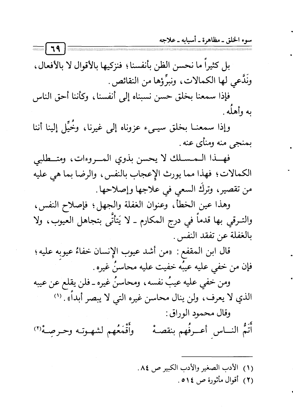 فهذا المسلك لا يحسن بذوي المروءات، ومتطلبي الكمالات، فهذا مما يورث الإعجاب بالنفس، والرضا بما هي عليه من تقصير، وترك السعي في علاجها وإصلاحها.