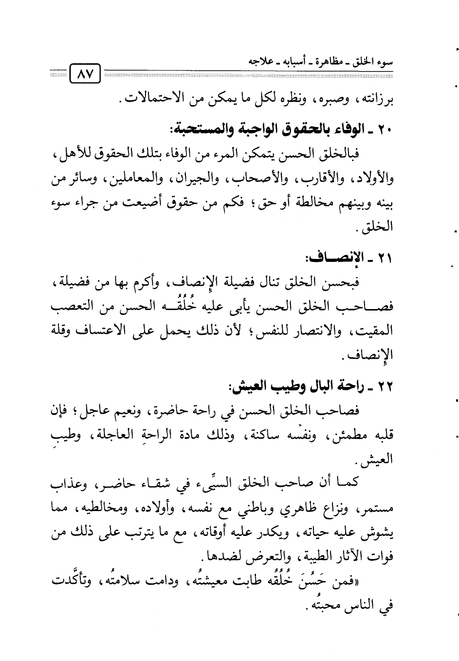 فبالخلق الحسن يتمكن المرء من الوفاء بتلك الحقوق للأهل، والأولاد، والأقارب، والأصحاب، والجيران، والمعاملين، وسائر من بينه وبينهم مخالطة أو حق؛ فكم من حقوق أضيعت من جراء سوء الخلق.