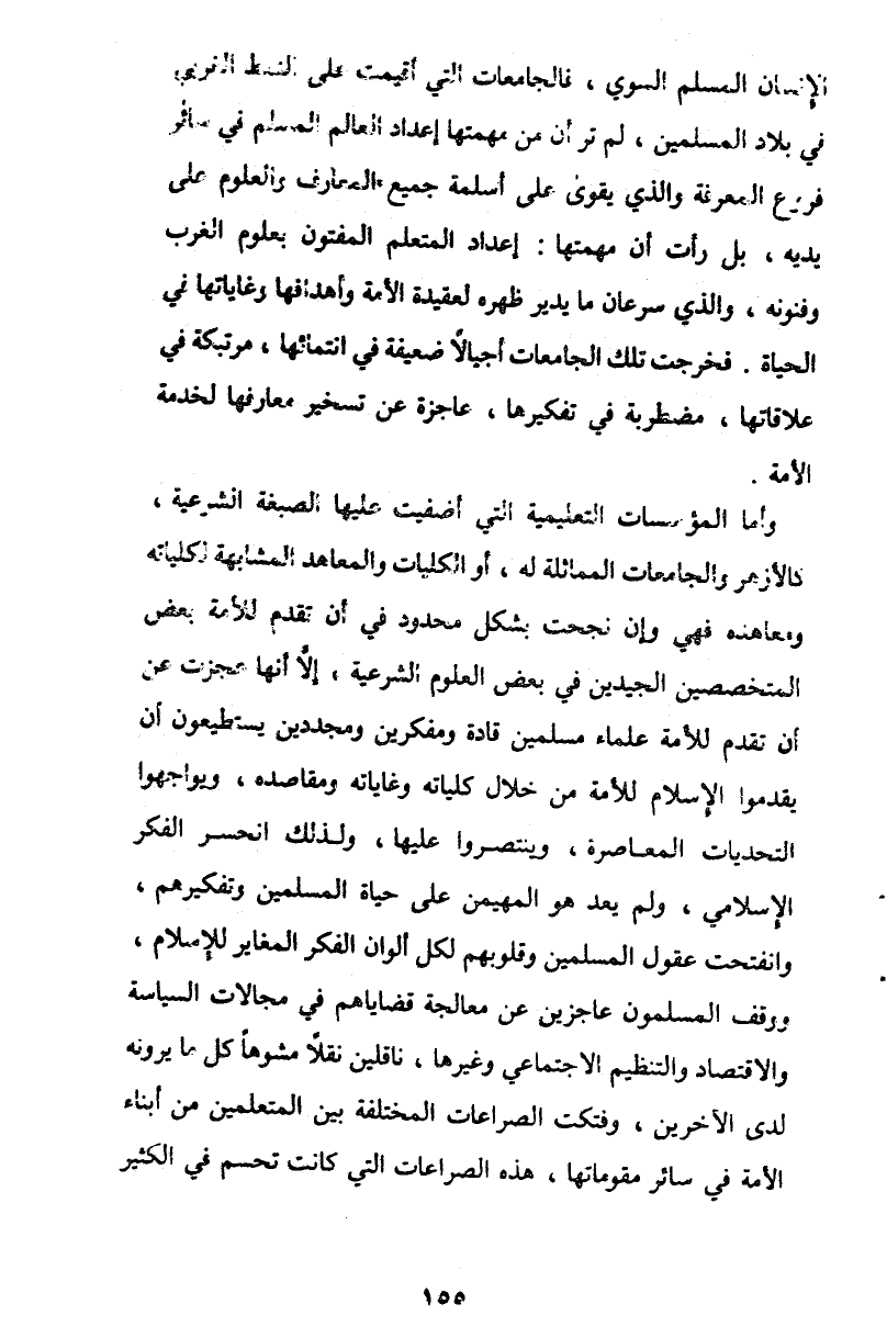 الإنسان المسلم السوي، فالجامعات التي أقيمت على النمط الغربي في بلاد المسلمين، لم تر أن من مهمتها إعداد العالم المسلم في سائر فروع المعرفة والذي يقوى على أسلمة جميع المعارف والعلوم على يديه، بل رأت أن مهمتها: إعداد المتعلم المفتون بعلوم الغرب وفنونه، والذي سرعان ما يدير ظهره لعقيدة الأمة وأهدافها وغاياتها في الحياة. فخرجت تلك الجامعات أجيالا ضعيفة في انتمائها، مرتبكة في علاقاتها، مضطربة في تفكيرها، عاجزة عن تسخير معارفها لخدمة الأمة.