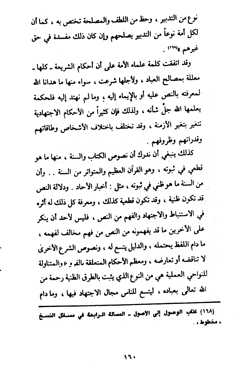 وقد اتفقت كلمة علماء الأمة على أن أحكام الشريعة كلها معللة بمصالح العباد، ولأجلها شرعت، سواء منها ما هدانا الله لمعرفته بالنص عليه أو بالإيماء إليه؛ وما لم نهتد اليه فلحكمة يعلمها الله جل شأنه، ولذلك فإن كثيرا من الأحكام الاجتهادية تتغير بتغير الأزمنة، وقد تختلف باختلاف الأشخاص وطاقاتهم وقدراتهم وظروفهم.
