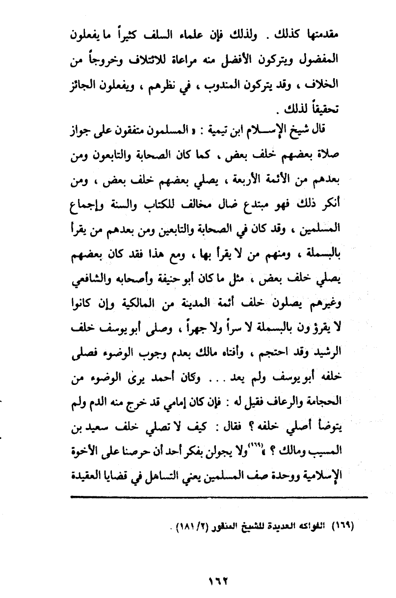 قال شيخ الإسلام ابن تيمية: «المسلمون متفقون على جواز صلاة بعضهم خلف بعض، كما كان الصحابة والتابعون ومن بعدهم من الأئمة الأربعة، يصلي بعضهم خلف بعض، ومن أنكر ذلك فهو مبتدع ضال مخالف للكتاب والسنة وإجماع المسلمين، وقد كان في الصحابة والتابعين ومن بعدهم من يقرأ بالبسملة، ومنهم من لا يقرأ بها، ومع هذا فقد كان بعضهم يصلي خلف بعض، مثل ما كان أبو حنيفة وأصحابه والشافعي وغيرهم يصلون خلف أئمة المدينة من المالكية وإن كانوا لا يقرؤون بالبسملة لا سرا ولا جهرا، وصلى أبو يوسف خلف الرشيد وقد احتجم، وأفتاه مالك بعدم وجوب الوضوء فصلى خلفه أبو يوسف ولم يعد ... وكان أحمد يرى الوضوء من الحجامة والرعاف فقيل له: فإن كان إمامي قد خرج منه الدم ولم يتوضأ أصلي خلفه؟ فقال: كيف لا تصلي خلف سعيد بن المسيب ومالك؟» (¬169) ولا يجولن بفكر أحد أن حرصنا على الأخوة الإسلامية ووحدة صف المسلمين يعني التساهل في قضايا العقيدة