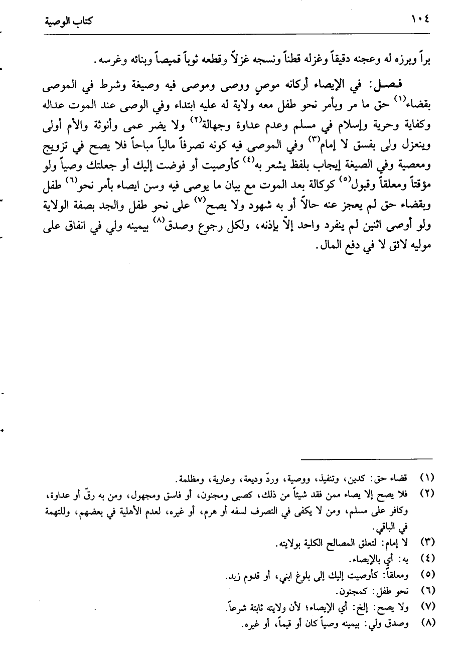 فصل: في الإيصاء أركانه موص ووصي وموصى فيه وصيغة وشرط في الموصي بقضاء1 حق ما مر وبأمر نحو طفل معه ولاية له عليه ابتداء وفي الوصي عند الموت عدالة وكفاية وحرية وإسلام في مسلم وعدم عداوة وجهالة2 ولا يضر عمى وأنوثة والأم أولى وينعزل ولي بفسق لا إمام3 وفي الموصى فيه كونه تصرفا ماليا مباحا فلا يصح في تزويج ومعصية وفي الصيغة أيجاب بلفظ يشعر به4 كأوصيب أو فوضت إليك أو جعلتك وصيا ولو مؤقتا ومعلقا وقبول5 كوكالة بعد الموت مع بيان ما يوصى فيه وسن أيصاء بأمر نحو6 طفل وبقضاء نحو حق لم يعجز عنه حالا أو به شهود ولا يصح7 على نحو طفل والجد بصفة الولاية ولو أوصى اثنين لم ينفرد واحد إلا بإذنه ولكل رجوع وصدق8 بيمينه ولي في إنفاق على موليه لائق لا في دفع المال.