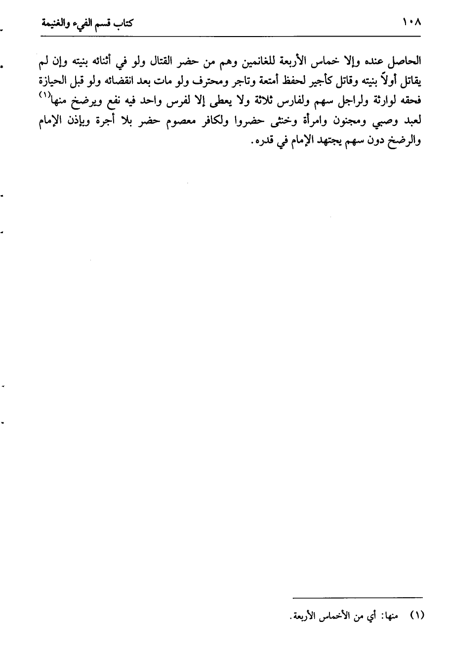 الحاصل عنده والأخماس الأربعة للغانمين من حضر القتال ولو في أثنائه بنيته وإن لم يقاتل أولا بنيته وقاتل كأجير لحفظ أمتعة وتاجر ومحترف ولو مات بعد انقضائه ولو قبل الحيازة فحقه لوارثه ولراجل سهم ولفارس ثلاثة ولا يعطى إلا لفرس واحد فيه نفع ويرضخ منها1 لعبد وصبي ومجنون وامرأة وخنثى حضروا ولكافر معصوم حضر بلا أجرة وبإذن الإمام والرضخ دون سهم يجتهد الإمام في قدره.