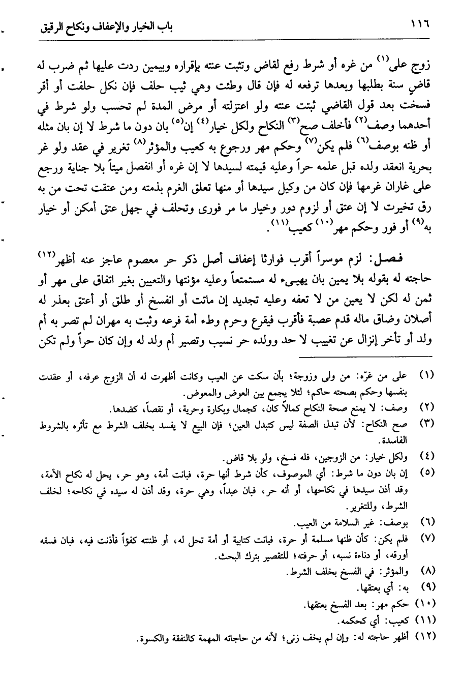زوج على1 من غره وشرط رفع لقاض وتثبت عنته بإقراره وبيمين ردت عليها ثم ضرب له قاض سنة بطلبها وبعدها ترفعه له فإن قال: وطئت وهي ثيب حلف فإن نكل حلفت فإن حلفت أو أقر فسخت بعد قول القاضي ثبتت عنته ولو اعتزلته أو مرضت المدة لم تحسب ولو شرط في أحدهما وصف2 فأخلف صح3 النكاح ولكل خيار4 إن5 بان دون ما شرط لا إن بان مثله أو ظنه بوصف6 فلم يكن7 وحكم مهر ورجوع به كعيب والمؤثر8 تغرير في عقد ولو غر بحرية انعقد ولده قبل علمه حرا وعليه قيمته لسيدها لا إن غره أو انفصل ميتا بلا جناية ورجع على غار إن غرمها فإن كان من وكيل سيدها أو منها تعلق الغرم بذمة ومن عتقت تحت من به رق تخيرت لا إن عتق أو لزم دور وخيار ما مر فوري وتحلف في جهل عتق أمكن أو خيار به9 أو فور وحكم مهر10 كعيب11.