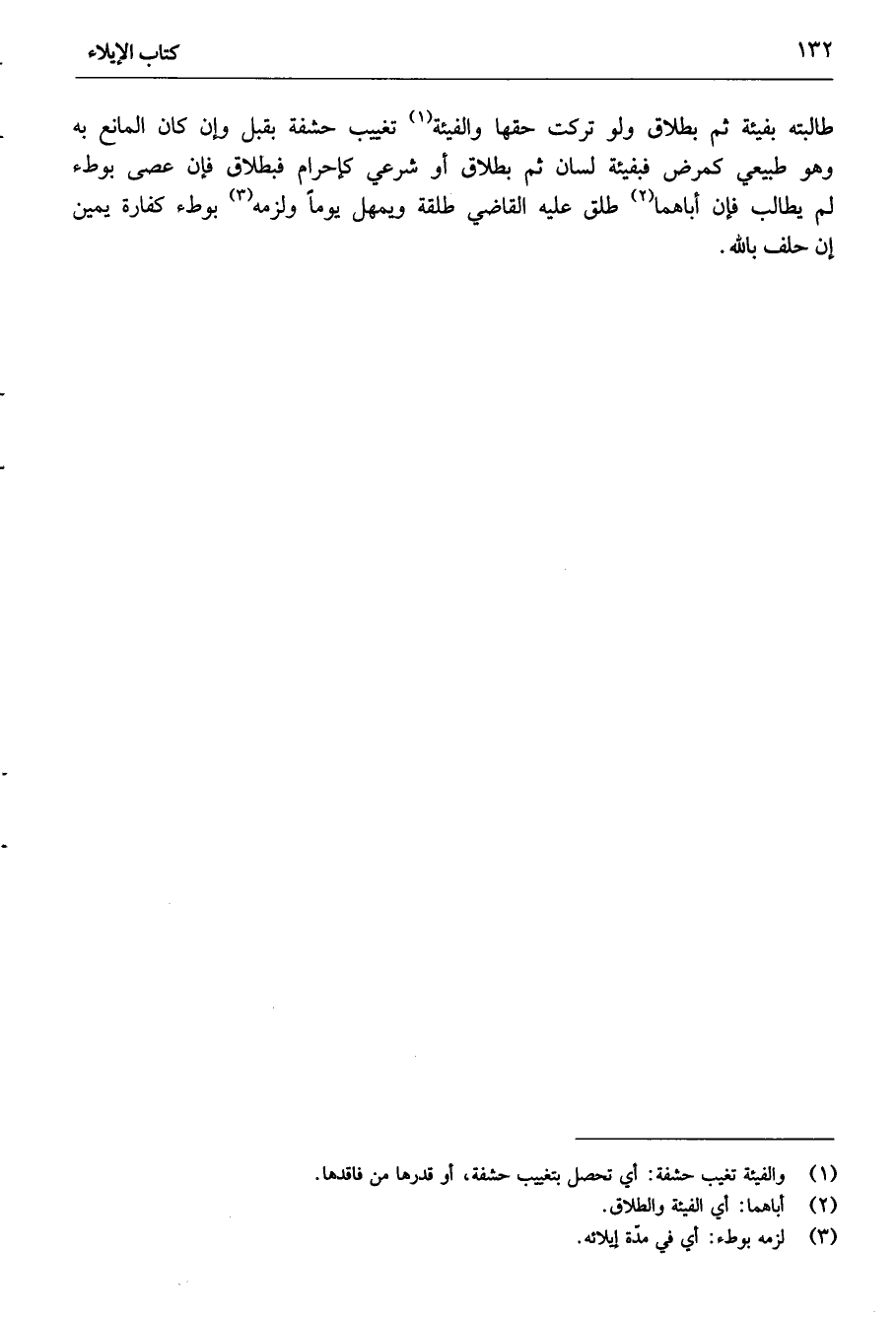 طالبته بفيئة ثم بطلاق ولو تركت حقها والفيئة1 تغييب حشفة بقبل وإن كان المانع به وهو طبيعي كمرض فبفيئة لسان ثم بطلاق أو بشرعي كإحرام فبطلاق فإن عصى بوطء لم يطالب فإن أباهما2 طلق عليه القاضي طلقة ويمهل يوما ولزمه3 بوطء كفارة يمين إن حلف بالله.