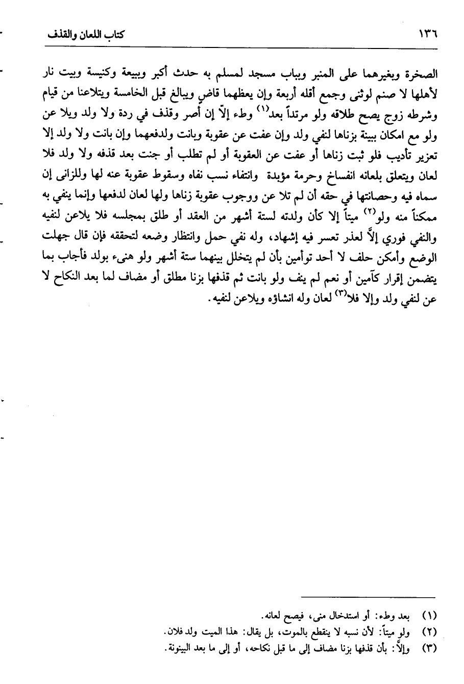 الصخرة وبغيرهما على المنبر وبباب مسجد لمسلم به حدث أكبر وببيعة وكنيسة وبيت نار لأهلها لا صنم لوثني وجمع أقله أربعة وأن يعظهما قاض ويبالغ قبل الخامسة ويتلاعنا من قيام وشرطه زوج يصح طلاقه ولو مرتدا بعد1 وطء لا إن أصر وقذف في ردة ولا ولد ويلاعن ولو مع إمكان بينة بزناها لنفي ولد وإن عفت عن عقوبة وبانت ولدفعها وإن بانت ولا ولد إلا تعزير تأديب فلو ثبت زناها أو عفت عن العقوبة أو لم تطلب أو جنت بعد قذفه ولا ولد فلا لعان ويتعلق بلعانه انفساخ وحرمة مؤبدة وانتفاء نسب نفاه وسقوط عقوبة عنه لها وللزاني إن سماه فيه وحصانتها في حقه إن لم تلاعن ووجوب عقوبة زناها ولها لعان لدفعها وإنما ينفي به ممكنا منه ولو2 ميتا وإلا كأن ولدته لستة أشهر من العقد أو طلق بمجلسه فلا يلاعن لنفيه والنفي فوري إلا لعذر تعسر فيه إشهاد وله نفي حمل وانتظار وضعه لتحققه فإن قال: جهلت الوضع وأمكن حلف لا أحد توأمين بأن لم يتخلل بينهما ستة أشهر ولو هنئ بولد فأجاب بما يتضمن إقرارا كآمين أو نعم لم ينف ولو بانت ثم قذفها بزنا مطلق أو مضافا لما بعد النكاح لاعن لنفي ولد وإلا فلا3 لعان وله إنشاؤه ويلاعن لنفيه.