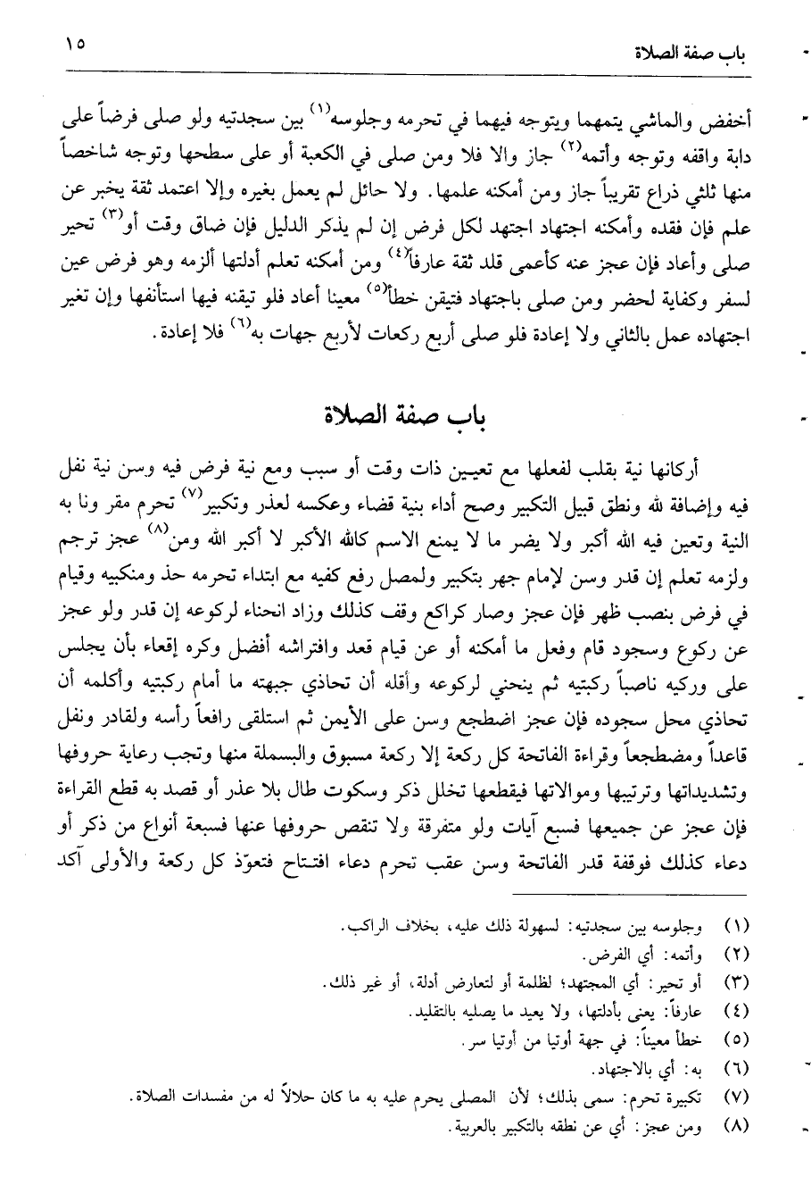 أركانها نية بقلب لفعلها مع تعين ذات وقت أو سبب ومع نية فرض فيه وسن نية نفل فيه وإضافة لله ونطق قبيل التكبير وصح أداء بنية وقضاء وعكسه لعذر وتكبير1 تحرم مقرونا به النية وتعين فيه الله أكبر ولا يضر ما لا يمنع الاسم كالله الأكبر لا أكبر الله ومن2 عجز ترجم ولزمه تعلم إن قدر وسن لإمام جهر بتكبير ولمصل رفع كفيه مع ابتداء تحرمه حذو منكبيه وقيام في فرض بنصب ظهر فإن عجز وصار كراكع وقف كذلك وزاد انحناء لركوعه إن قدر ولو عجز عن ركوع وسجود قام وفعل ما أمكنه أو عن قيام قعد وافتراشه أفضل وكره إقعاء بأن يجلس على وركيه ناصبا ركبتيه ثم ينحني لركوعه وأقله أن تحاذي جبهته ما أمام ركبتيه وأكمله أن تحاذي محل سجوده فإن عجز اضطجع وسن على الأيمن ثم استلقى رافعا رأسه ولقادر نفل قاعدا ومضطجعا وقراءة الفاتحة كل ركعة إلا ركعة مسبوق والبسملة منها وتجب رعاية حروفها وتشديداتها وترتيبها وموالاتها فيقطعها تخلل ذكر وسكوت طال بلا عذر أو قصد به قطع القراءة فإن عجز عن جميعها فسبع آيات ولو متفرقة لا تنقص حروفها عنها فسبعة أنواع من ذكر أو دعاء كذلك فوقفة قدر الفاتحة وسن عقب تحرم دعاء افتتاح فتعوذ كل ركعة والأولى آكد