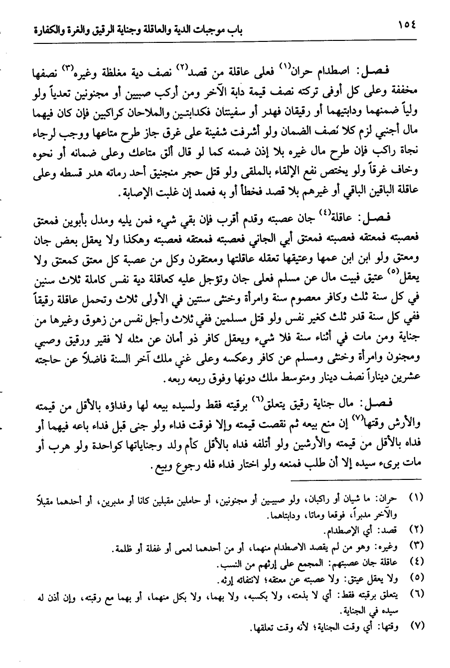 فصل: عاقلة4 جان عصبته وقدم أقرب فإن بقي شيء فمن يليه ومدل بأبوين فمعتق فعصبته فمعتقه فعصبته فمعتق أبي الجاني فعصبته فمعتقه فعصبته وهكذا ولا يعقل بعض جان ومعتق ولو ابن ابن عمها وعتيقها تعقله عاقلتها ومعتقون وكل من عصبة كل معتق كمعتق ولا يعقل5 عتيق فبيت مال عن مسلم فعلى جان وتؤجل عليه كعاقلة دية نفس كاملة ثلاث سنين في كل سنة ثلث وكافر معصوم سنة ودية امرأة وخنثى سنتين في الأولى ثلث وتحمل عاقلة رقيقا ففي كل سنة قدر ثلث كغير نفس ولو قتل مسلمين ففي ثلاث وأجل نفس من زهوق وغيرها من جناية ومن مات في أثناء سنة فلا شيء ويعقل كافر ذو أمان عن مثله لا فقير ورقيق وصبي ومجنون وامرأة وخنثى ومسلم عن كافر وعكسه وعلى غني ملك آخر السنة فاضلا عن حاجته عشرين دينارا نصف دينار ومتوسط ملك دونها وفوق ربعه ربعه.