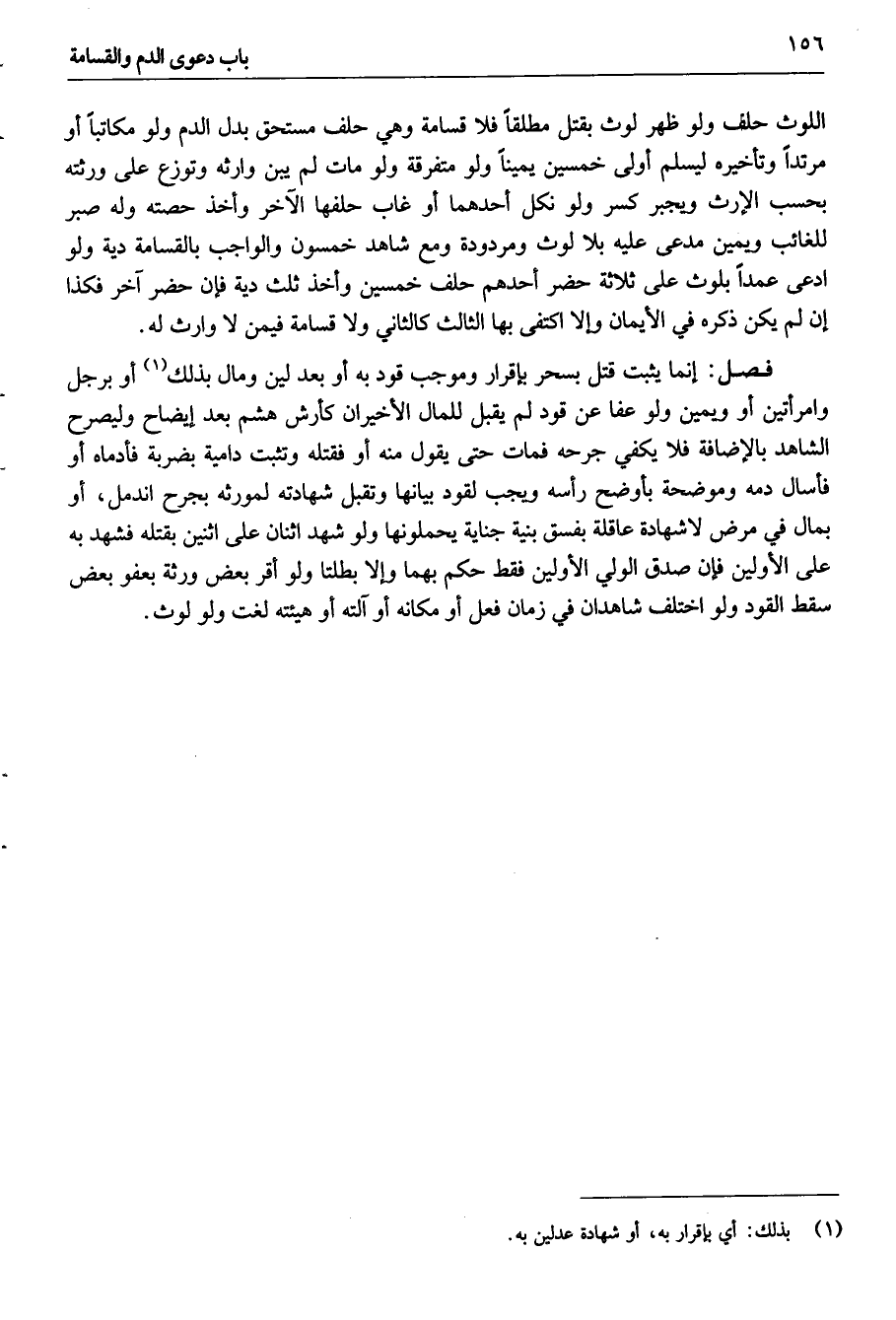 فصل: إنما يثبت قتل بسحر بإقرار وموجب قود به أو بعدلين ومال بذلك1 أو برجل وامرأتين أو ويمين ولو عفا عن قود لم يقبل للمال الأخيران كأرش هشم بعد إيضاح وليصرح الشاهد بالإضافة فلا يكفي جرحه فمات حتى يقول منه: أو فقتله وتثبت دامية بضربه فأدماه أو فأسال دمه وموضحة بأوضح رأسه ويجب لقود بيانها وتقل شهادته لمورثه بجرح اندمل أو بمال في مرض لا شهادة عاقلة بفسق بينة جناية يحملونها ولو شهد اثنان على اثنين بقتله فشهدا به على الأولين فإن صدق الولي الأولين فقط حكم بهما وإلا بطلتا ولو أقر بعض ورثة بعفو بعض سقط القود ولو اختلف شاهدان في زمان فعل أو مكانه أو آلته أو هيئته لغت ولو لوث.