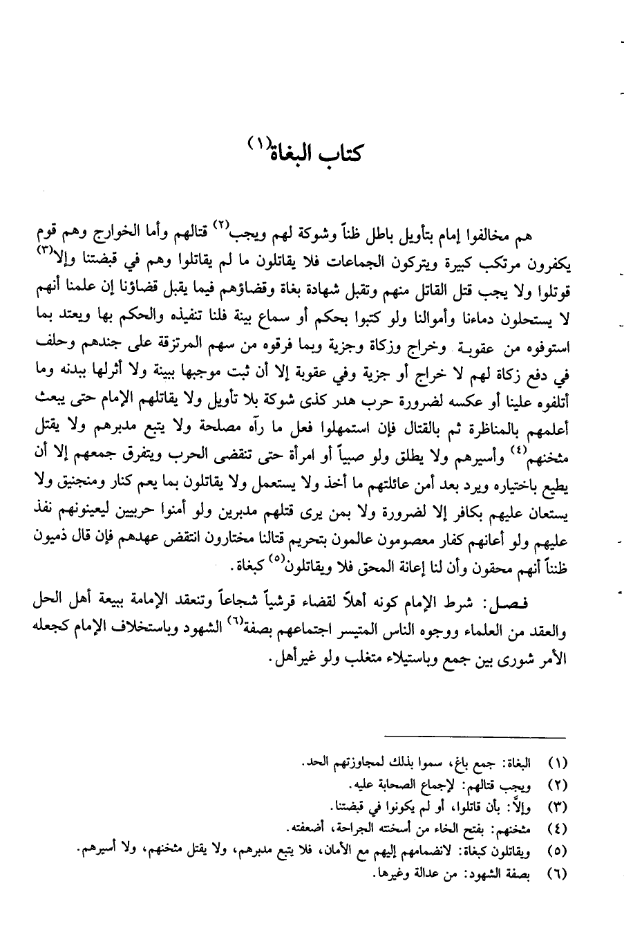 هم مخالفو إمام بتأويل باطل ظنا وشوكة لهم ويجب2 قتالهم وأما الخوارج وهم قوم يكفرون مرتكب كبيرة ويتركون الجماعات فلا يقاتلون ما لم يقاتلوا وهو في قبضتنا وإلا3 قوتلوا ولا يجب قتل القاتل منهم وتقبل شهادة بغاة وقضاؤهم فيما يقبل قضاؤنا إن علمنا أنهم لا يستحلون دماءنا وأموالنا ولو كتبوا بحكم أو سماع بينة فلنا تنفيذه والحكم بها ويعتد بما استوفوه من عقوبة وخراج وزكاة وجزية وبما فرقوه من سهم المرتزقة على جندهم وحلف في دفع زكاة لهم لا خراج أو جزية وفي عقوبة إلا إن ثبت موجبها ببينة ولا أثر لها ببدنه وما أتلفوه علينا أو عكسه لضرورة حرب هدر كذي شوكة بلا تأويل ولا يقاتلهم الإمام حتى يبعث أمينا فطنا ناصحا يسألهم ما ينقمون فإن ذكروا مظلمة أو شبهة أزالها فإن أصروا وعظهم ثم أعلمهم بالمناظرة ثم بالقتال فإن استمهلوا فعل ما رآه مصلحة ولا يتبع مدبرهم ولا يقتل مثخنهم4 وأسيرهم ولا يطلق ولو صبيا أو امرأة حتى تنقضي الحرب ويتفرق جمعهم إلا أن يطيع باختياره ويرد بعد أمن غائلتهم ما أخذ ولا يستعمل ولا يقاتلون بما يعم كنار ومنجنيق ولا يستعان عليهم بكافر إلا لضرورة ولا بمن يرى قتلهم مدبرين ولو آمنوا حربيين ليعينوهم نفذ عليهم ولو أعانهم كفار معصومون عالمون بتحريم قتالنا مختارون انتقض عهدهم فإن قال ذميون: ظننا أنهم محقون وأن لنا إعانة المحق فلا ويقاتلون5 كبغاة.