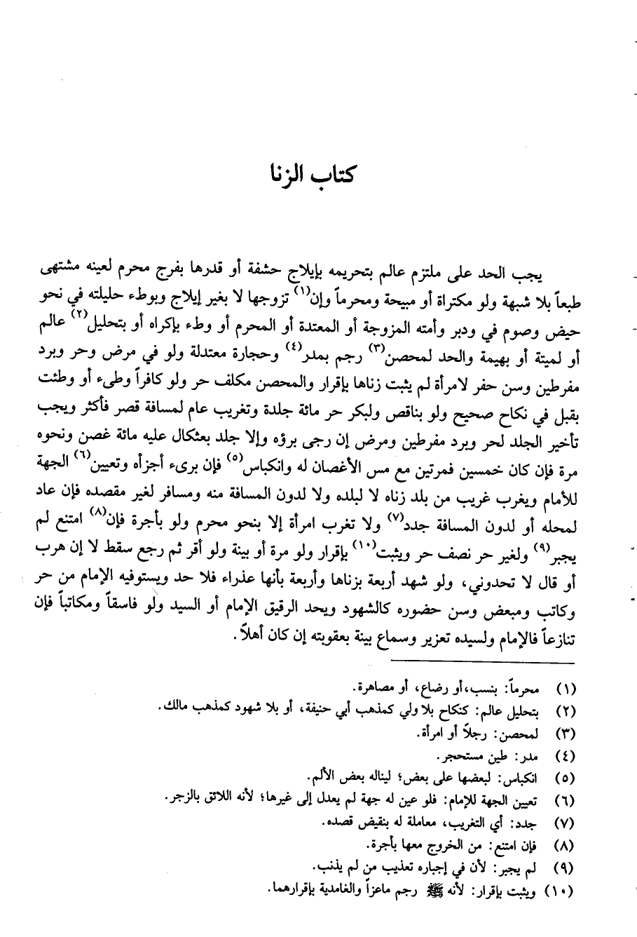 يجب الحد على ملتزم عالم بتحريمه بإيلاج حشفة أو قدرها بفرج محرم لعينه مشتهى طبعا بلا شبهة ولو مكتراة أو مبيحة ومحرما وإن1 تزوجها لا بغير إيلاج وبوطء حليلته في نحو حيض وصوم وفي دبر وأمته المزوجة أو المعتدة أو المحرم أو وطء بإكراه أو بتحليل2 عالم أو لميتة أو بهيمة والحد لمحصن3 رجم بمدر4 وحجارة معتدلة ولو في مرض وحر وبرد مفرطين وسن حفر لامرأة لم يثبت زناها بإقرار والمحصن مكلف حر ولو كافرا وطئ أو وطئت بقبل في نكاح صحيح ولو بناقص ولبكر حر مائة جلدة وتغريب عام لمسافة قصر فأكثر ويجب تأخير الجلد لحر وبرد مفرطين ومرض إن رجى برؤه وإلا جلد بعثكال عليه مائة غصن ونحوه مرة فإن كان خمسون فمرتين مع مس الأغصان له أو انكباس5 فإن برأ أجزأه وتعيين6 الجهة للإمام ويغرب غريب من بلد زناه لا لبلده ولا لدون المسافة منه ومسافر لغير مقصده فإن عاد لمحله أو لدون المسافة منه جدد7 ولا تغرب امرأة إلا بنحو محرم ولو بأجرة فإن8 امتنع لم يجبر9 ولغير حر نصف حر ويثبت10 بإقرار ولو مرة أو بينة ولو أقر ثم رجع سقط لا إن هرب أو قال: لا تحدوني ولو شهد أربعة بزناها وأربع بأنها عذراء فلا حد ويستوفيه الإمام من حر ومكاتب ومبعض وسن حضوره كالشهود ويحد الرقيق الإمام أو السيد ولو فاسقا أو مكاتبا فإن تنازعا فالإمام ولسيده تعزيره وسماع بينة بعقوبته إن كان أهلا.