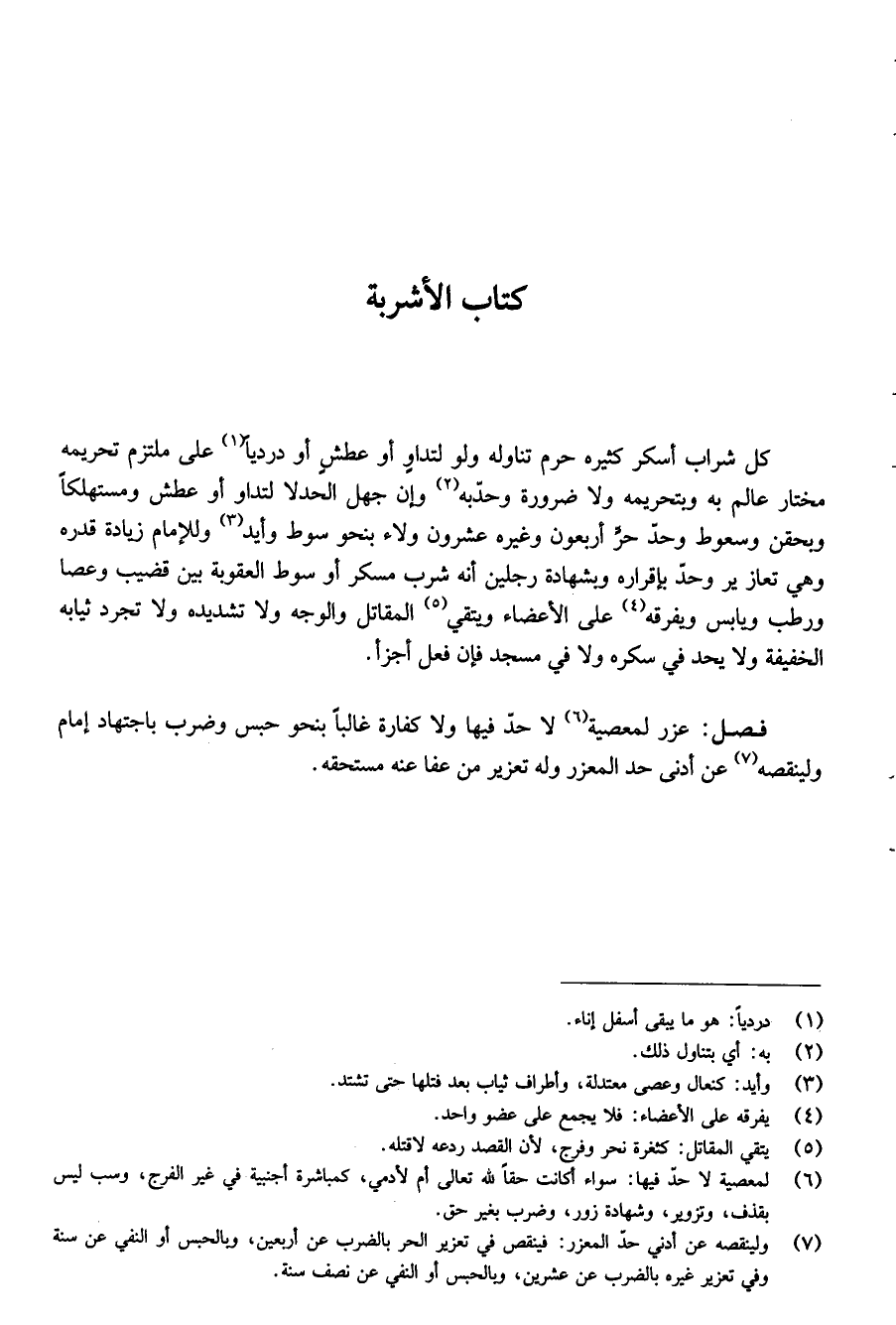 كل شراب أسكر كثيره حرم تناوله ولو لتداو أو عطش أو درديا1 على ملتزم تحريمه مختار عالم به وبتحريمه ولا ضرورة وحد به2 وإن جهل الحد لا لتداو أو عطش ولا مستهلكا ولا بحقن وسعوط وحد حر أربعون وغيره عشرون ولاء بنحو سوط وأيد3 وللإمام زيادة قدره وهي تعازير وحد بإقراره وبشهادة رجلين أنه شرب مسكرا وسوط العقوبة بين قضيب وعصا ورطب ويابس ويفرقه4 على الأعضاء ويتقي5 المقاتل والوجه ولا تشديده ولا تجرد ثيابه الخفيفة ولا يحد في سكره ولا في مسجد فإن فعل أجزأ.