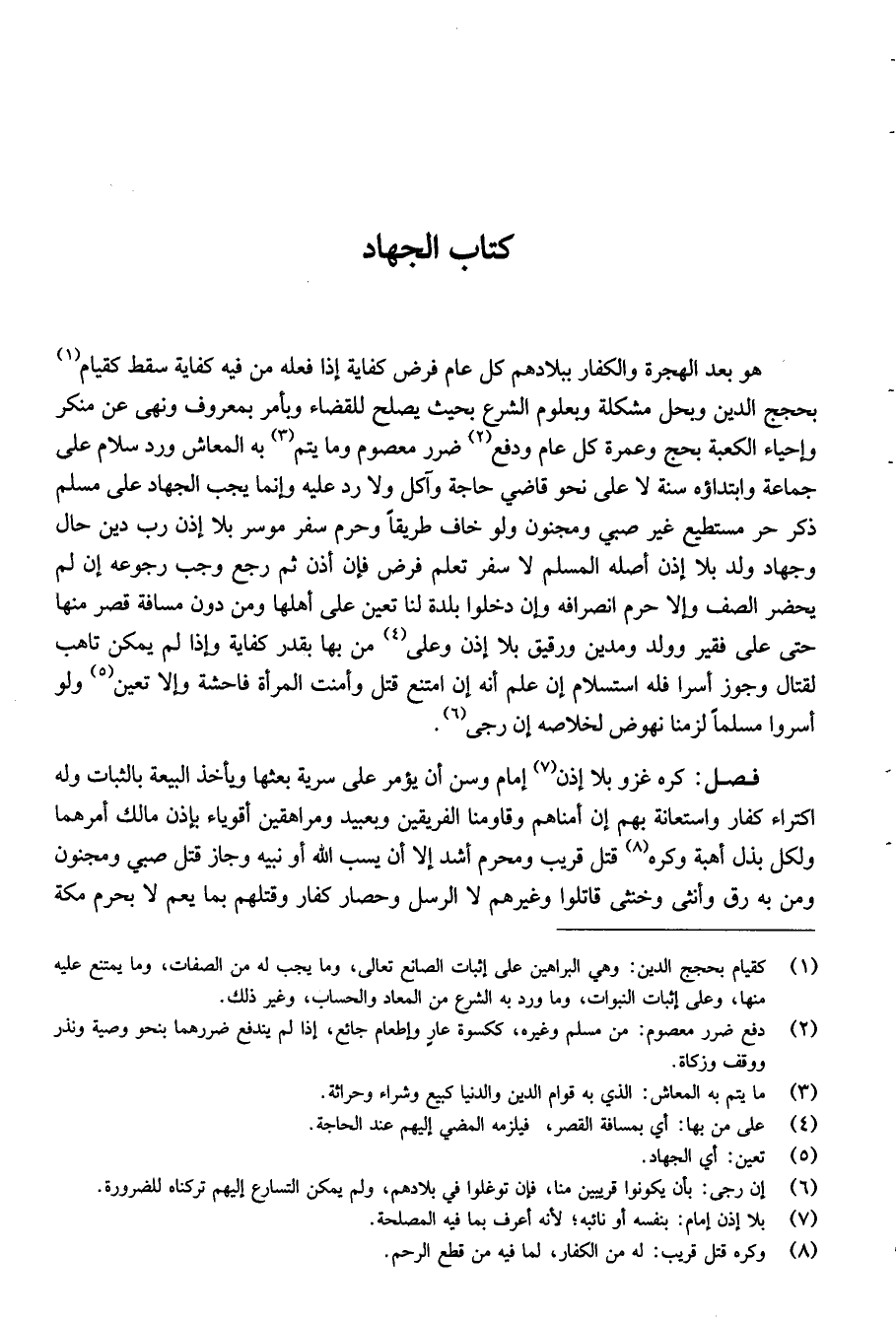 هو بعد الهجرة والكفار ببلادهم كل عام فرض كفاية إذا فعله من فيه كفاية سقط كقيام1 بحجج الدين وبحل مشكله وبعلوم الشرع بحيث يصلح للقضاء وبأمر بمعروف ونهي عن منكر وإحياء الكعبة بحج وعمرة كل عام ودفع2 ضرر معصوم وما يتم3 به المعاش ورد سلام على جماعة وابتداؤه سنة لا على نح وقاضي حاجة وآكل ولا رد عليه وإنما يجب الجهاد على مسلم ذكر حر مستطيع غير صبي ومجنون ولو خاف طريقا وحرم سفر موسر بلا إذن رب دين حال وجهاد ولد بلا إذن أصله المسلم لا سفر تعلم فرض فإن أذن ثم رجع وجب رجوعه إن لم يحضر الصف وإلا حرم انصرافه وإن دخلوا بلدة لنا تعين على أهلها ومن دون مسافة قصر منها حتى على فقير وولد ومدين ورقيق بلا إذن وعلى4 من بها بقدر كفاية وإذا لم يمكن تأهب لقتال وجوز أسرا فله استسلام إن علم أنه إن امتنع قتل وأمنت المرأة فاحشة وإلا تعين5 ولو أسروا مسلما لزمنا نحوض لخلاصه إن رجي6.
