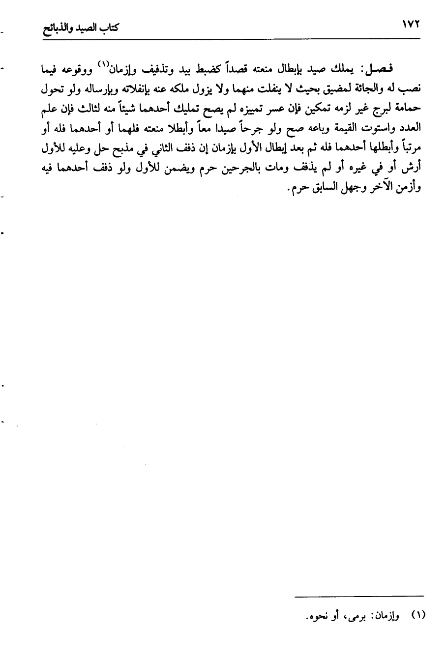 فصل: يملك صيد بإبطال منعته قصدا كضبط بيد وتذفيف وإزمان1 ووقوعه فيما نصب له وإلجائه لمضيق بحيث لا ينفلت منهما ولا يزول ملكه عنه بانفلاته وبإرساله ولو تحول حمامه لبرج غيره لزمه تمكين فإن عسر تمييزه لم يصح تمليك أحدهما شيئا منه لثالث فإن علم العدد واستوت القيمة وباعاه صح ولو جرحا صيدا معا وأبطلا منعته فلهما أو أحدهما فله أو مرتبا وأبطلها أحدهما فله ثم بعد إبطال الأول بأزمان إن ذفف الثاني في مذبح حل وعليه للأول أرش أو في غيره أو لم يذفف ومات بالجرحين حرم ويضمن للأول ولو ذفف أحدهما فيه وأزمن الآخر وجهل السابق جرم.