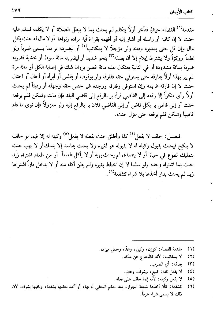 مقدمة1 القضاء حينئذ فتأخر أو لا يتكلم لم يحنث بما لا يبطل الصلاة أو لا يكلمه فسلم عليه حنث لا إن كاتبه أو راسله أو أشار إليه أو أفهمه بقراءة آية مراده ونواها أو لا مال له حنث بكل مال وإن قل حتى بمدبره ودينه ولو مؤجلا لا بمكاتب2 أو ليضربنه بر بما يسمى ضربا ولو لطما ووكزا ولا يشترط إيلام إلا أن يصفه3 بنحو شديد أو ليضربنه مائة سوط أو خشبة فضربه ضربة بمائة مشدودة أو في الثانية بعثكال عليه مائة غصن بر وإن شك في إصابة الكل أو مائة مرة لم يبر بهذا أو لا يفارقه حتى يستوفي حقه ففارقه ولو بوقوف أو بفلس أو أبرأه أو أحال أو احتال حنث لا إن فارقه غريمه وإن استوفى وفارقه ووجده غير جنس حقه وجهله أو رديئا لم يحنث أو لا أرى منكرا إلا رفعته إلى القاضي فرآه بر بالرفع إلى قاضي البلد فإن مات وتمكن فلم يرفعه حنث أو إلى قاض بر بكل قاض أو إلى القاضي فلان بر بالرفع إليه ولو معزولا فإن نوى ما دام قاضيا وتمكن فلم يرفعه حتى عزل حنث.