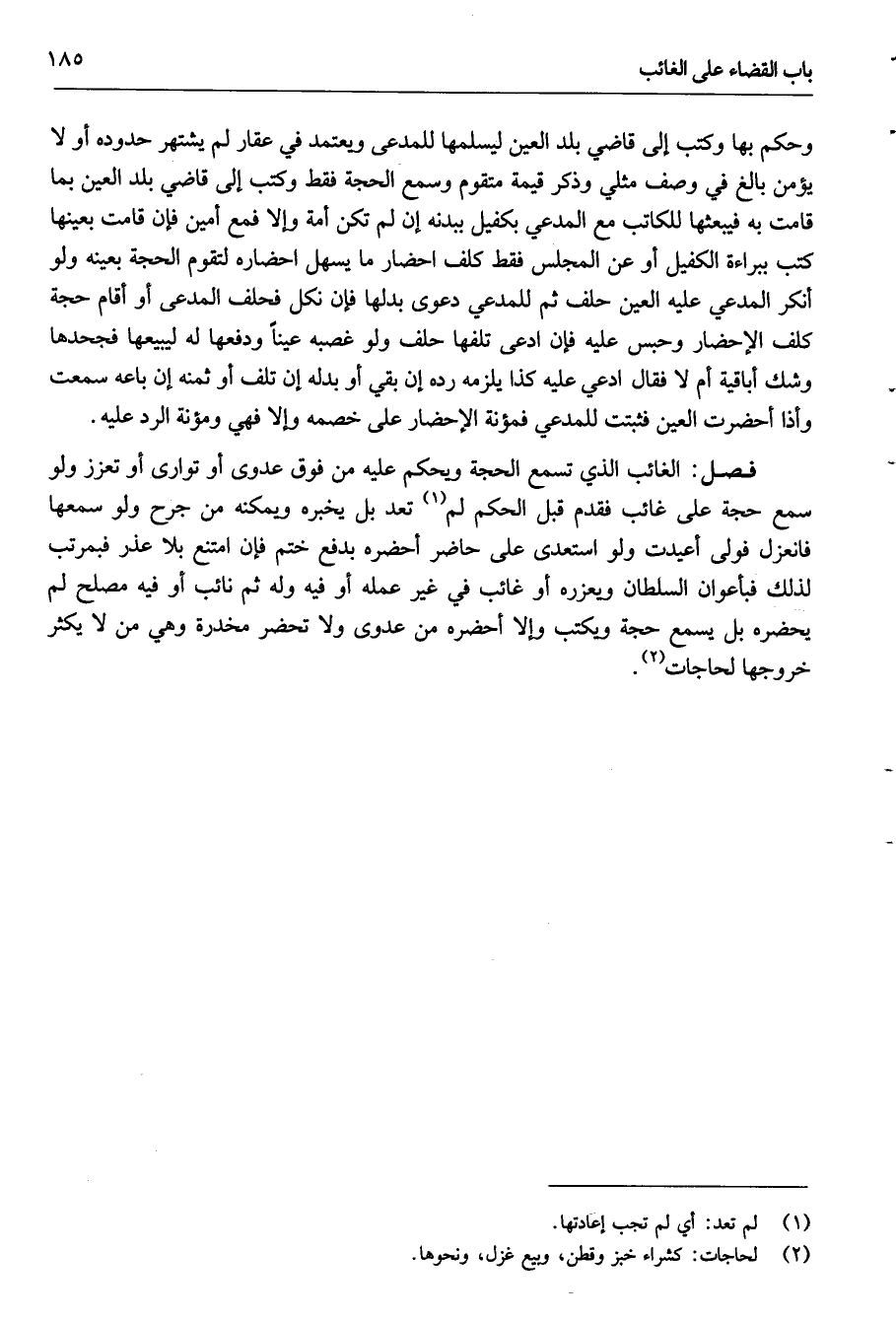 فصل: الغائب الذي تسمع الحجة ويحكم عليه من فوق عدوى أو توارى أو تعزز ولو سمع حجة على غائب فقدم قبل الحكم لم1 تعد بل يخبره ويمكنه من جرح ولو سمعها فانعزل فولى أعيدت ولو استعدى على حاضر أحضره بدفع ختم فإن امتنع بلا عذر فبمرتب لذلك فبأعوان السلطان ويعزره أو غائب في غير عمله أو فيه وله ثم نائب أو فيه مصلح لم يحضره بل يسمع حجة ويكتب وإلا أحضره من عدوى ولا تحضر مخدرة وهي من لا يكثر خروجها لحاجات2.