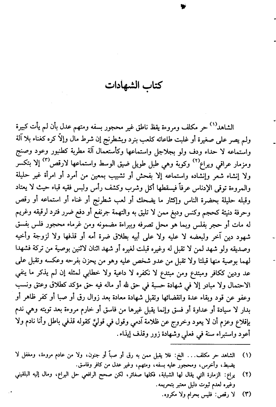 الشاهد1 حر مكلف ذو مروءة يقظ ناطق غير محجور بسفه ومتهم عدل بأن لم يأت كبيرة ولم يصر على صغيرة أو غلبت طاعاته كلعب بنرد وبشطرنج إن شرط مال وإلا كره كغناء بلا آلة واستماعه لإحداء ودف ولو بجلاجل واستماعها وكاستعمال آلة مطربة كطنبور وعود وصنج ومزمار عراقي ويراع2 وكوبة وهي طبل طويل ضيق الوسط واستماعها لا رقص3 إلا بتكسر ولا إنشاء شعر وإنشاده واستماعه إلا بفحش أو تشبيب بمعين من أمرد أو امرأة غير حليلة والمروءة توقي الأدناس عرفا فيسقطها أكل وشرب وكشف رأس ولبس فقيه قباء أو قلنسوة حيث لا يعتاد وقبلة حليلة بحضرة الناس وإكثار ما يضحك أو لعب شطرنج أو غناء أو استماعه أو رقص وحرفة دنيئة كحجم وكنس ودبغ ممن لا تليق به والتهمة جر نفع أو دفع ضرر فترد لرقيقه وغريم له مات أو حجر بفلس وبما هو محل تصرفه وببراءة مضمومة ومن غرماء محجور فلس بفسق شهود دين آخر ولبعضه لا عليه ولا على أبيه بطلاق ضرة أمه أو قذفها ولا لزوجة وأخيه وصديقه ولو شهد لمن لا تقبل له وغيره قبلت لغيره أو شهد اثنان لاثنين بوصية من تركة فشهدا لهما بوصية منها قبلتا ولا تقبل من عدو شخص عليه وهو من يحزن بفرحه وعكسه وتقبل على عدو دين ككافر ومبتدع ومن مبتدع لا نكفره لا داعية ولا خطابي لمثله إن لم يذكر ما ينفي الاحتمال ولا مبادر إلا في شهادة حسبة في حق لله أو ماله فيه حق مؤكد كطلاق وعتق ونسب وعفو عن قود وبقاء عدة وانقضائها وتقبل شهادة معادة بعد زوال رق أو صبا أو كفر ظاهر أو بدار لا سيادة أو عداوة أو فسق وإنما يقبل غيرها من فاسق أو خارم مروءة بعد توبته وهي ندم بإقلاع وعزم أن لا يعود وخروج عن ظلامة آدمي وقول في قولي كقوله قذفي باطل وأنا نادم ولا أعود واستبراء سنة في فعلي وشهادة زور وقذف إيذاء.