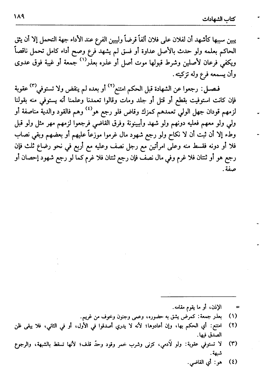 يبين سببها كأشهد أن لفلان على فلان ألفا قرضا وليبين الفرع عند الأداء جهة التحمل إلا أن يثق الحاكم بعلمه ولو حدث بالأصل عداوة أو فسق لم يشهد فرع وصح أداء كامل تحمل ناقصا ويكفي فرعان لأصلين وشرط قبولها موت أصل أو عذره بعذر1 جمعة أو غيبة فوق عدوى وأن يسميه فرع وله تزكيته.