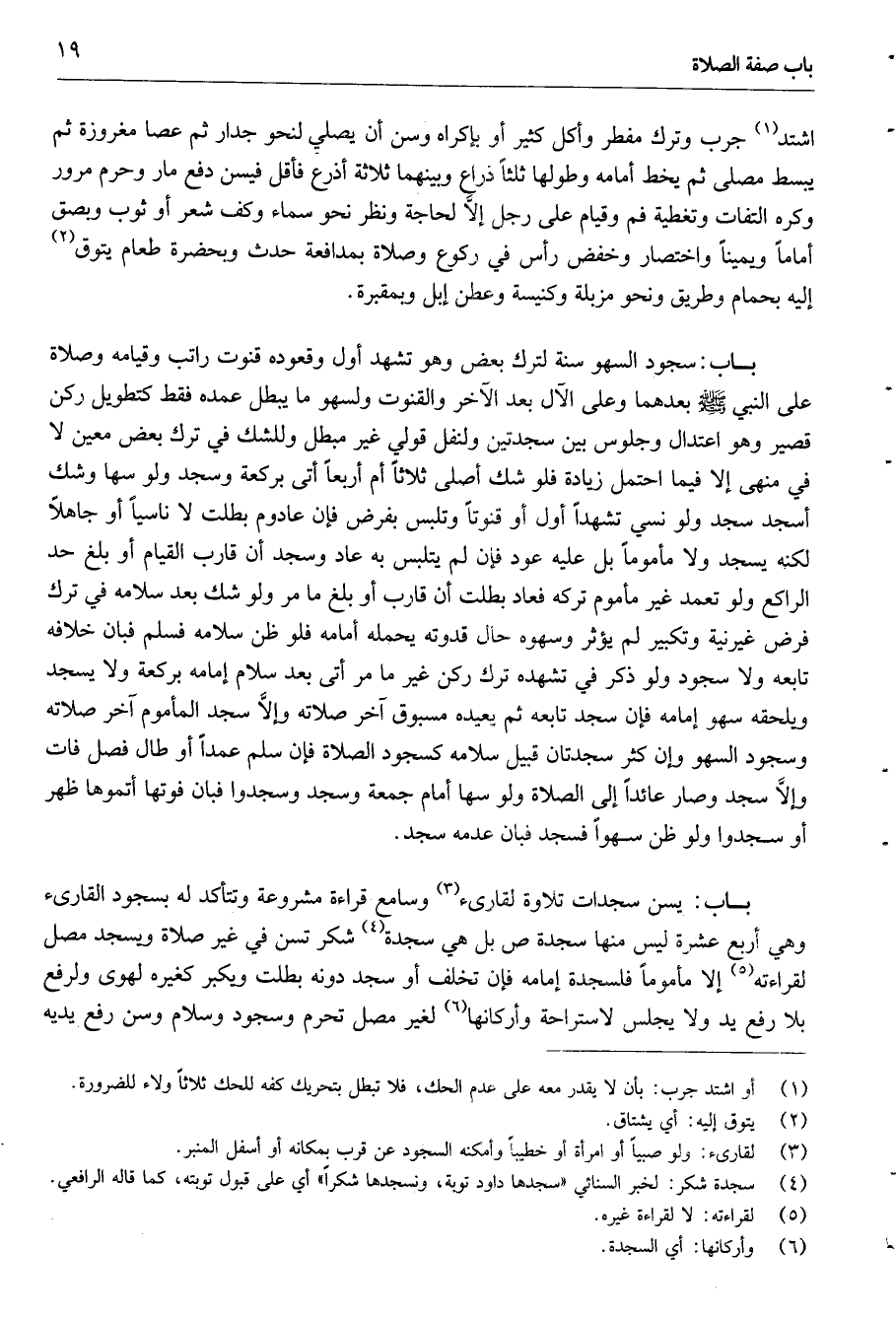 باب تسن سجدات تلاوة لقارئ3 وسامع قراءة مشروعة وتتأكد له بسجود القارئ وهي أربع عشرة ليس منها سجدة "ص" بل هي سجدة4 شكر تسن في غير صلاة ويسجد مصل لقراءته5 إلا مأموما فلسجدة إمامه فإن تخلف أو سجد دونه بطلت ويكبر كغيره لهوى ولرفع بلا رفع يد ولا يجلس لاستراحة وأركانها6 لغير مصل تحرم وسجود وسلام وسن رفع يديه