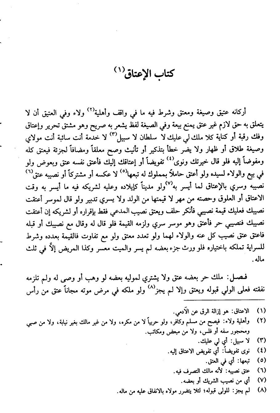 أركانه عتيق وصيغة ومعتق وشرط فيه ما في واقف وأهلية2 ولاء وفي العتيق أن لا يتعلق به حق لازم غير عتق يمنع بيعه وفي الصيغة لفظ يشعر به صريح وهو مشتق تحرير وإعتاق وفك رقبة أو كناية كلا ملك لي عليك لا سلطان لا سبيل3 لا خدمة أنت سائبة أنت مولاي وصيغة طلاق أو ظهار ولا يضر خطأ بتذكير أو تأنيث وصح معلقا ومضافا لجزئه فيعتق كله ومفوضا إليه فلو قال: خيرتك ونوى4 تفويضا أو إعتاقك إليك فأعتق نفسه عتق وبعوض ولو في بيع والولاء لسيده ولو أعتق حاملا بمملوك له تبعها5 لا عكسه أو مشتركا أو نصيبه عتق6 نصيبه وسرى بالإعتاق لما أيسر به7 ولو مدينا كإيلاده وعليه لشريكه قيمة ما أيسر به وقت الإعتاق أو العلوق وحصة من مهر لا قيمتها من الولد ولا يسري تدبير ولو قال: لموسر أعتقت نصيبك فعليك قيمة نصيبي فأنكر حلف ويعتق نصيب المدعي فقط بإقراره أو لشريكه إن أعتقت نصيبك فنصيبي حر فأعتق وهو موسر سرى ولزمه القيمة فلو قال له وقال: مع نصيبك أو قبله فأعتق عتق نصيب كل عنه والولاء لهما ولو تعدد معتق ولو مع تفاوت فالقيمة بعدده وشرط للسراية تملكه باختياره فلو ورث جزء بعضه لم يسر والميت معسر وكذا المريض إلا في ثلث ماله.
